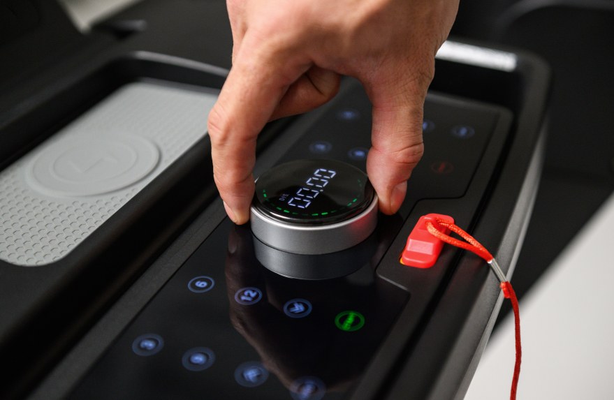 Управление — через сенсорную консоль, вращаемую LED-кнопку или кнопки на поручнях. На LED-дисплее отображаются ключевые метрики, динамический спидометр меняет цвет с ростом скорости.