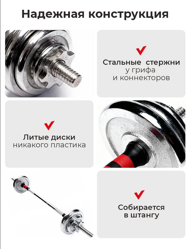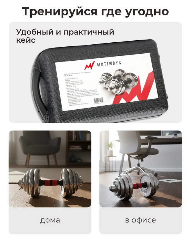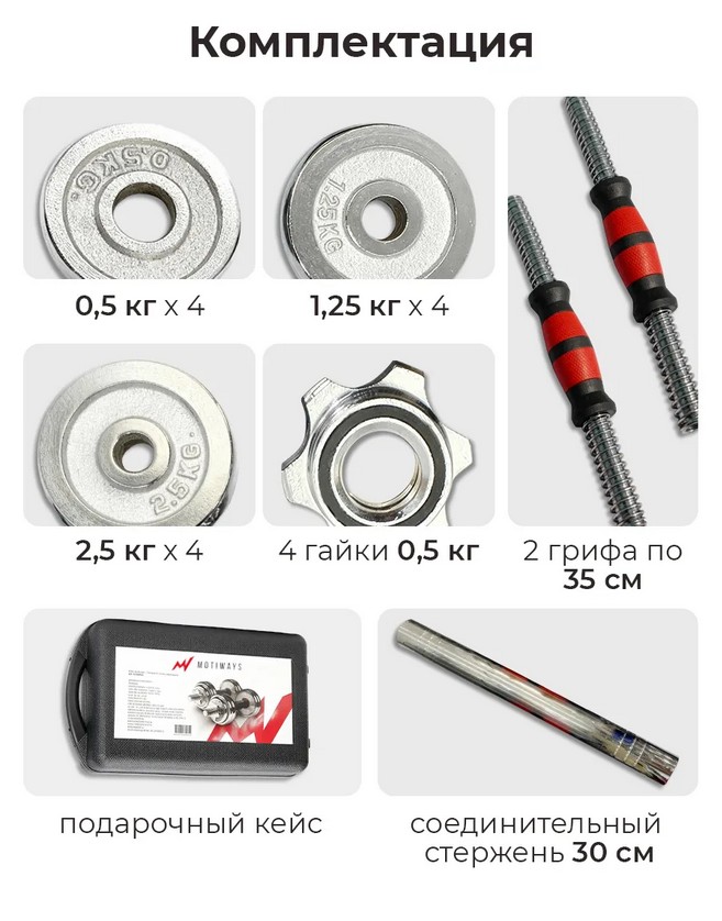 Из набора гантелей MOTIWAYS с грифом для штанги (20 кг) можно собрать 2 гантели по 10 кг каждая, или штангу 20 кг.ХарактеристикиВес кг.