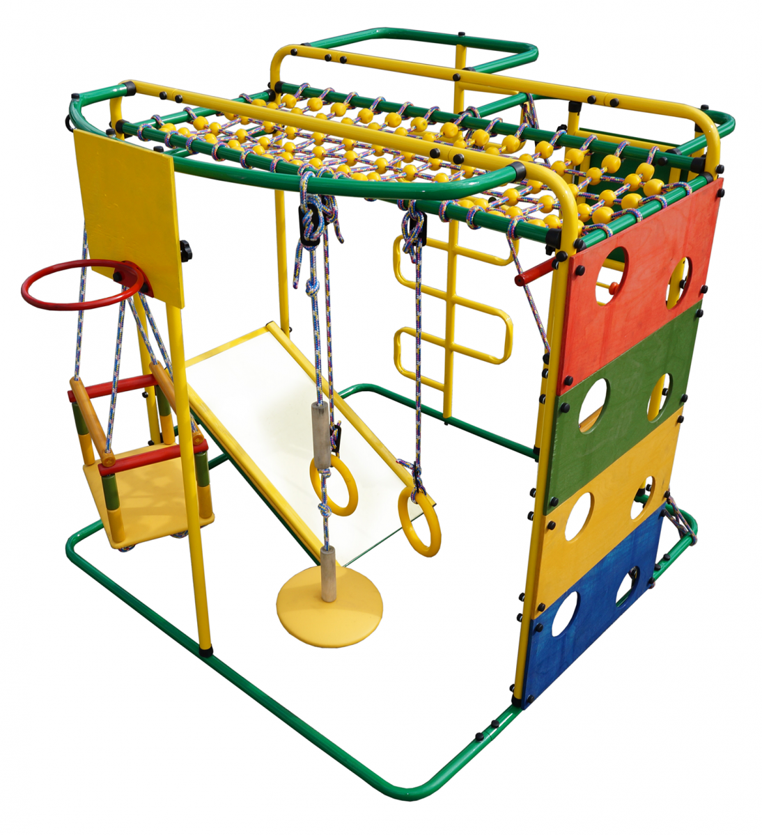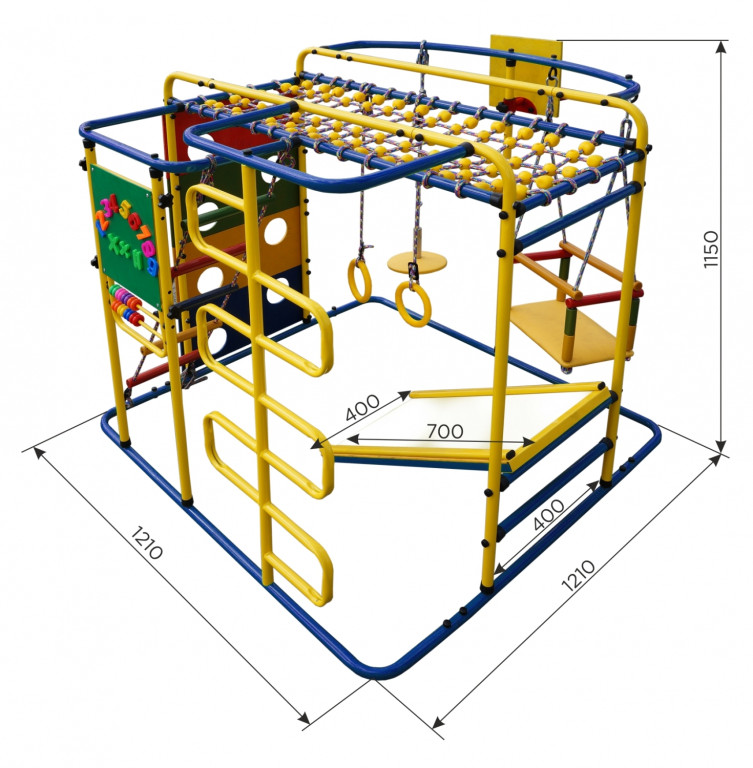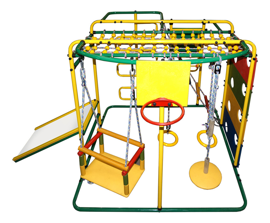 Развлечения для детей в комплексе представлены различными модулями. Так, гимнастическая классика на кольцах способствует укреплению мышц и суставов, а качели с бортиками обеспечивают ощущение полета. Тарзанка помогает развить ловкость и цепкость, а кольцо - координацию и меткость. Сетка для лазания развивает ловкость, а шарики на переплетениях выполняют массажную функцию. На занятиях также доступны счёты и мольберт, способствующие одновременному развитию творческого и логического мышления.
