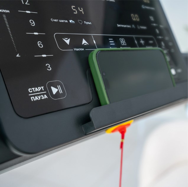 На консоли беговой дорожки размещены 5 LED-дисплеев с белой индикацией, отображающих различные показатели: время, скорость, дистанция, уровень наклона, калории, пульс, шаги и профиль программы.