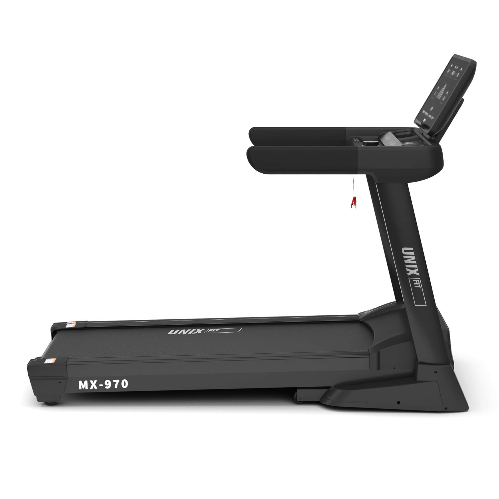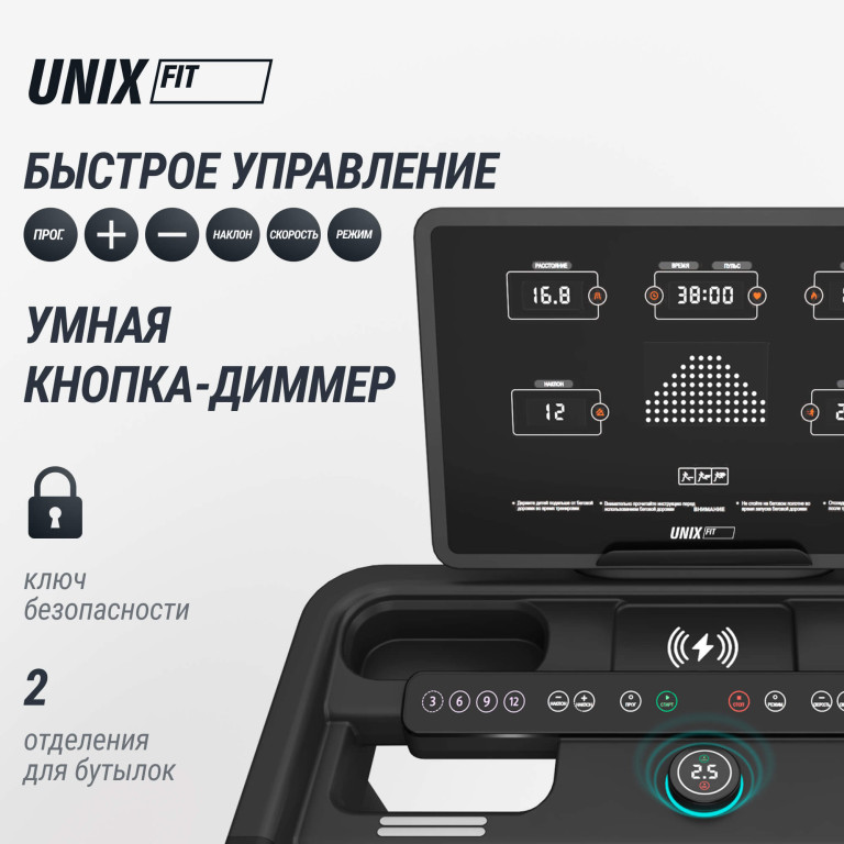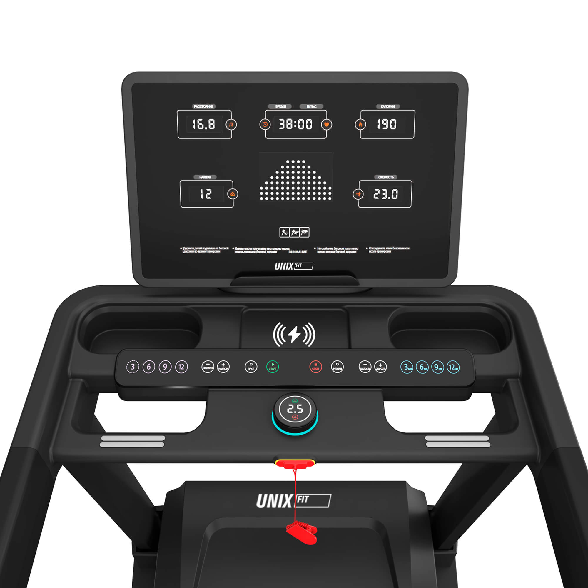UNIX Fit MX-970 — инновационная электрическая беговая дорожка премиум-класса для дома с функцией беспроводной зарядки, созданная для пользователей, которые ценят эффективность тренировок, высокий уровень комфорта и современные технологии. Универсальность модели делает ее отличным выбором как для новичков, так и для опытных спортсменов.