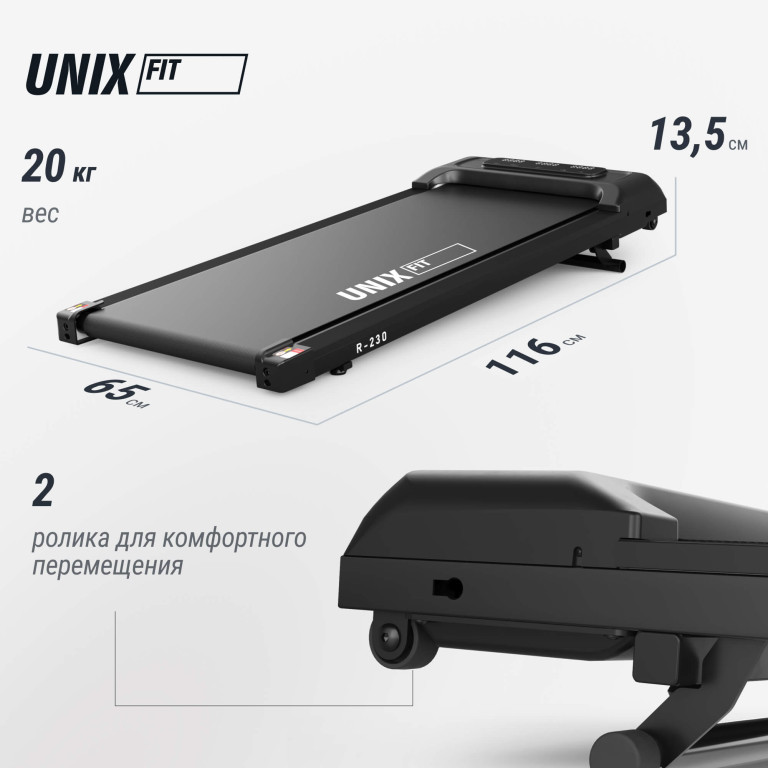 Компактная беговая дорожка UNIX Fit R-230 со складной конструкцией Беговая дорожка электрическая без поручней UNIX Fit R-230 — оптимальный выбор для тех, кто хочет заниматься спортом дома, не выделяя под тренировки много места. Компактный и ультратонкий кардиотренажер сочетает современный дизайн, функциональность и удобство ежедневного использования. Беговая дорожка без поручней легко адаптируется под условия квартиры или загородного дома. Небольшие габариты модели позволяют установить ее даже в ограниченном пространстве, сохранив свободу передвижения. Для удобного перемещения предусмотрены два транспортировочных ролика, благодаря которым тренажер легко передвинуть в нужное место.