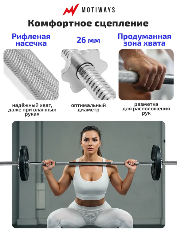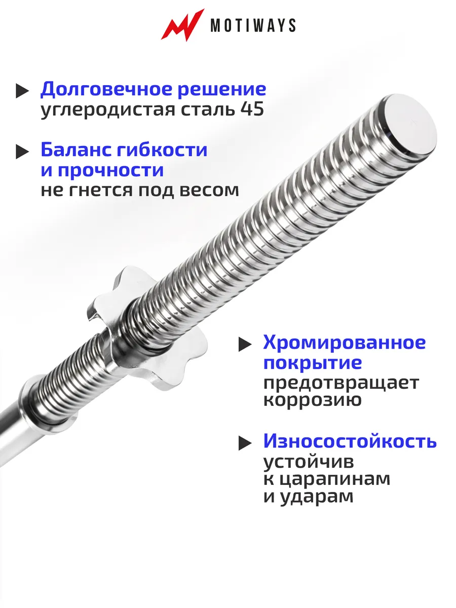 Гриф для штанги 120 см прямой стальной Motiways для тяги и приседаний, жима лежа, замки гайки в комплекте, диаметр 26 мм - эффективный помощник в спорте.