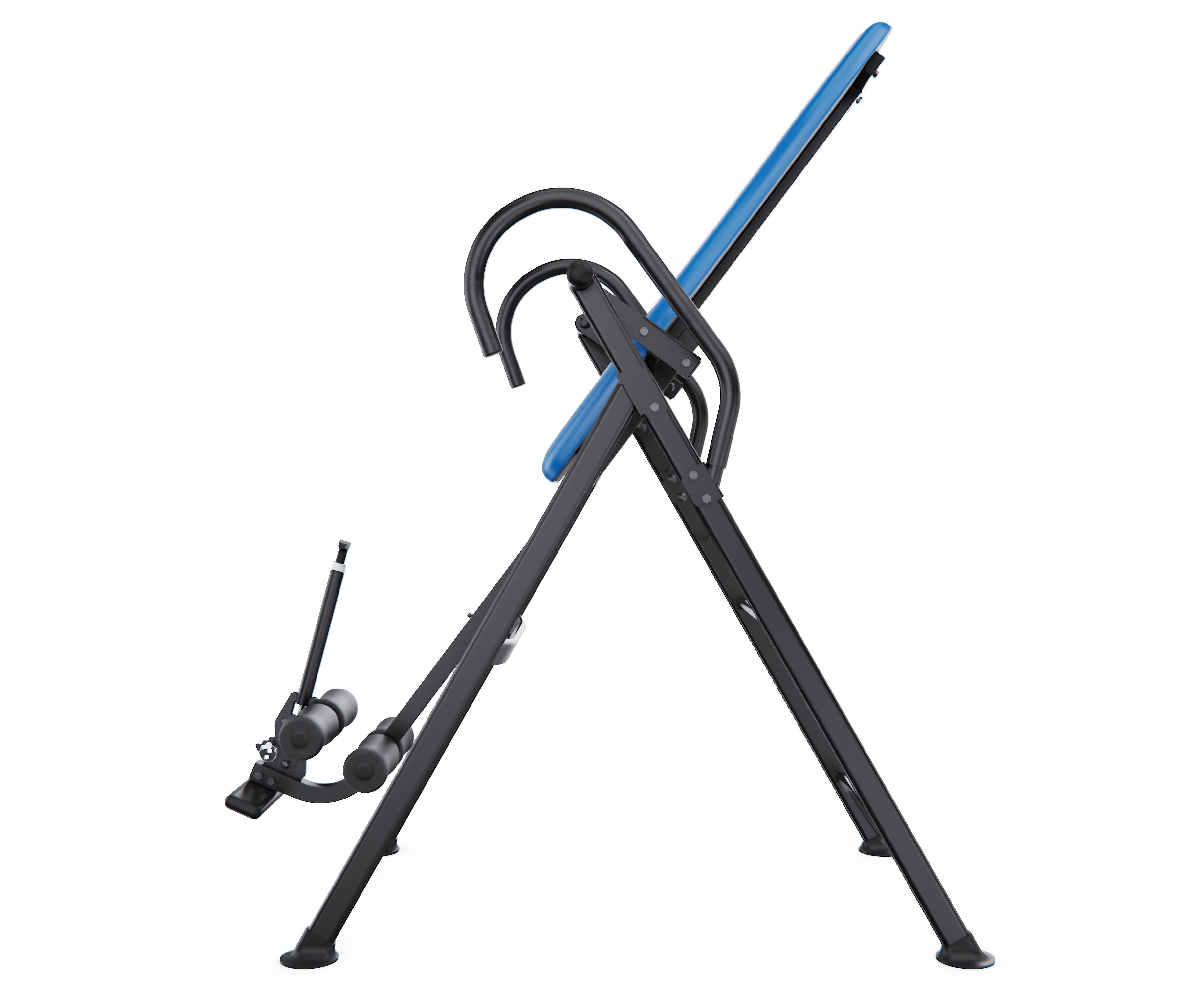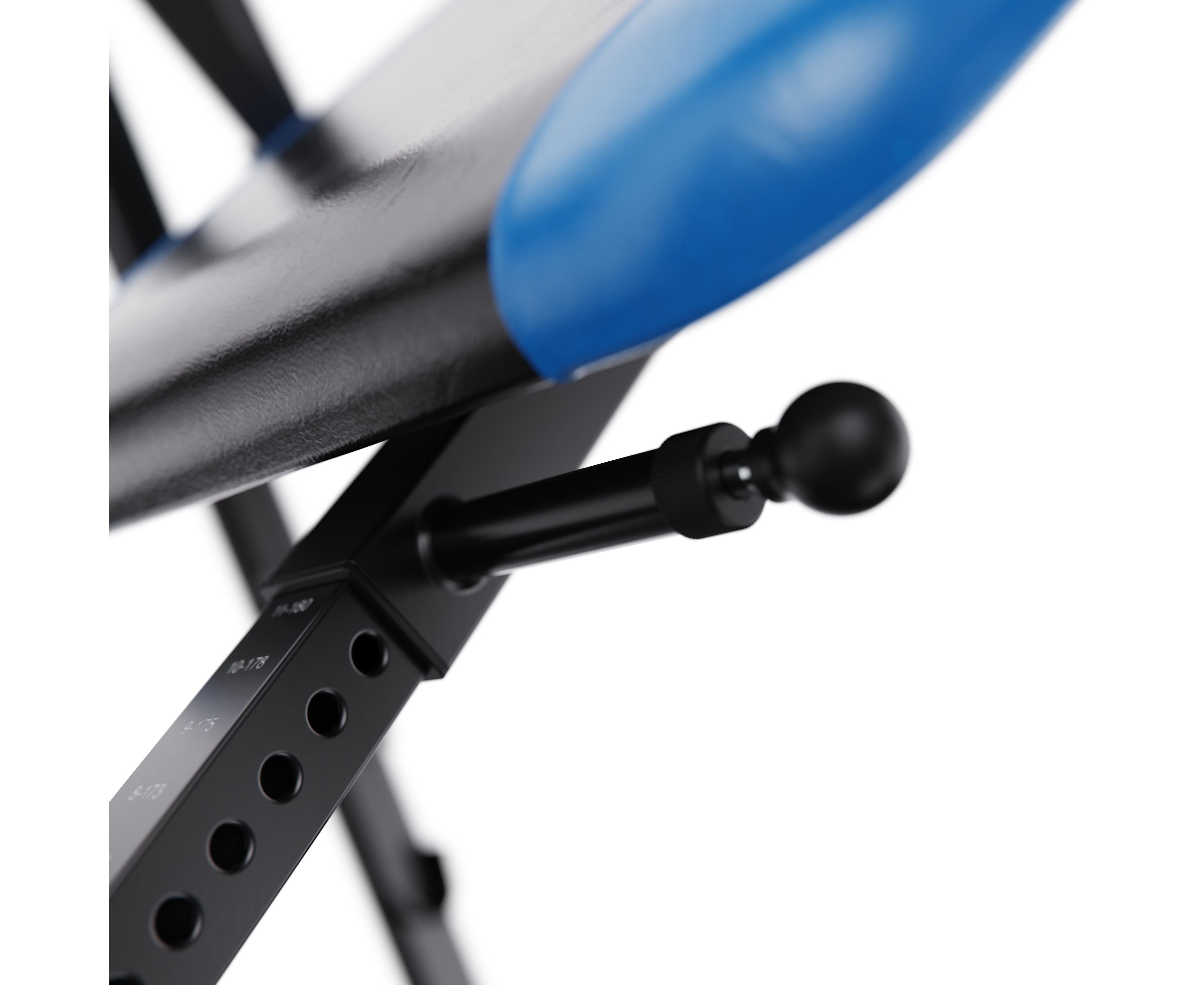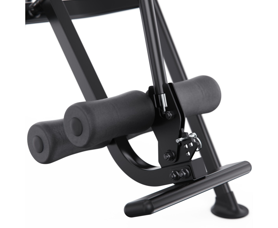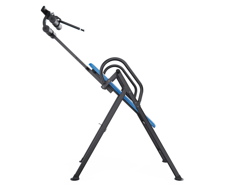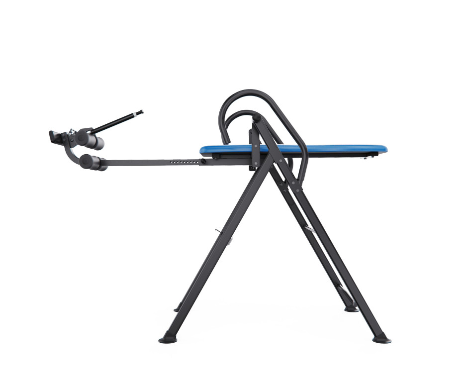 Угол наклона регулируется с помощью задней планки с тремя фиксированными положениями: легкая, умеренная и усиленная инверсия. При снятой планке стол позволяет принимать вертикальное положение до 90 градусов.