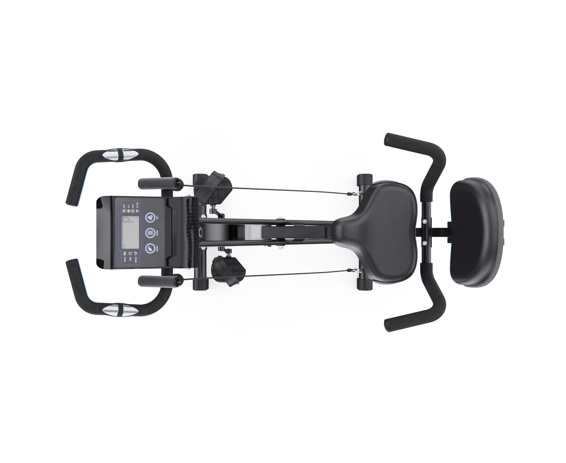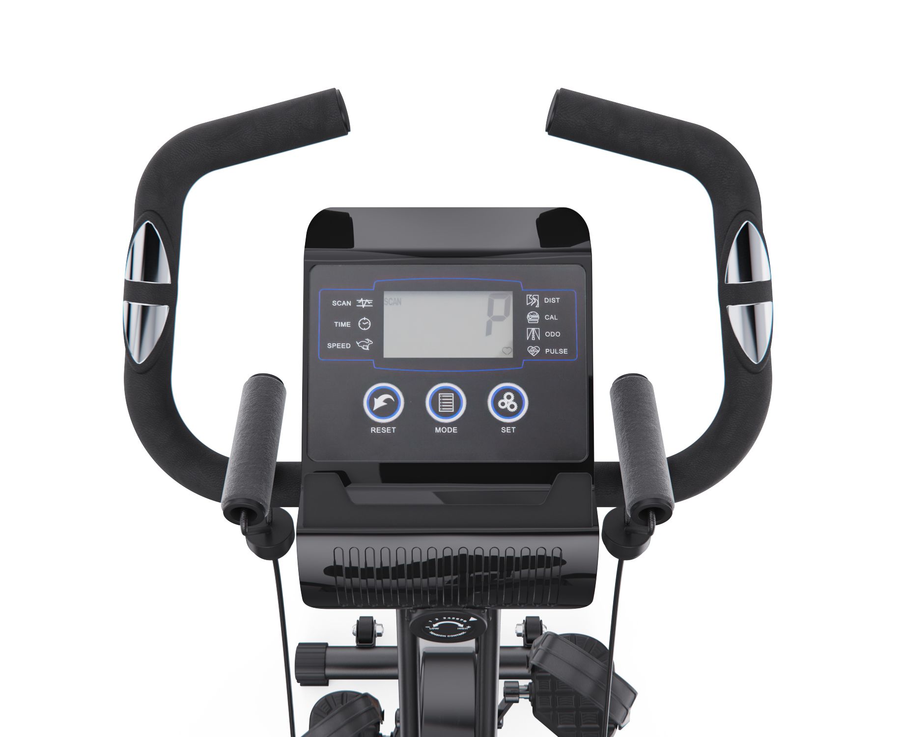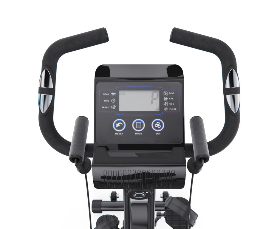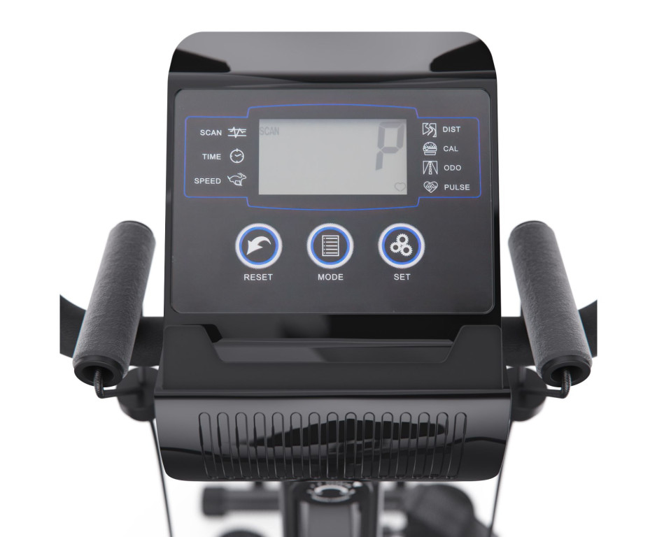 Магнитная система с 8 уровнями механической регулировки и маховиком весом 3 кг обеспечивает плавный и тихий ход. Сиденье регулируется по высоте в шести положениях. Встроенный монохромный LCD-дисплей, работающий от батареек, показывает ключевые параметры тренировки: скорость, время, дистанцию, пульс и калории. Для контроля нагрузки в рукоятки встроены датчики пульса.