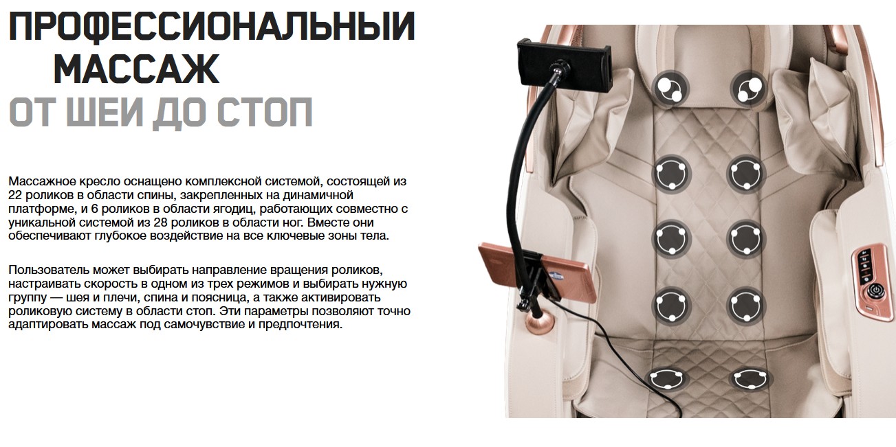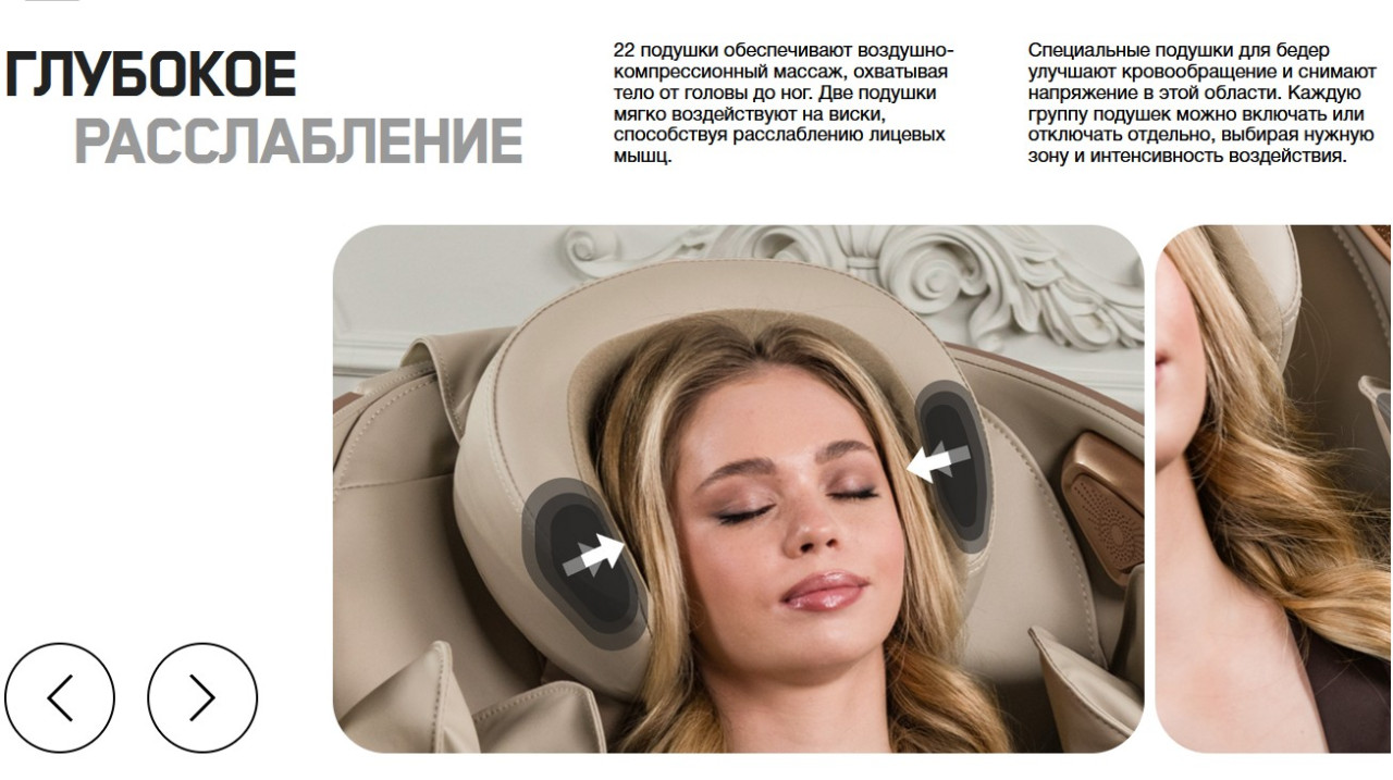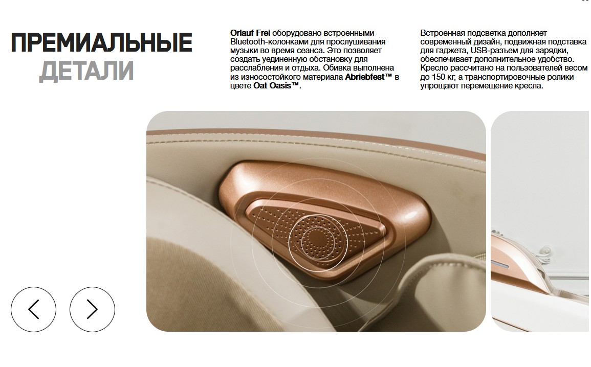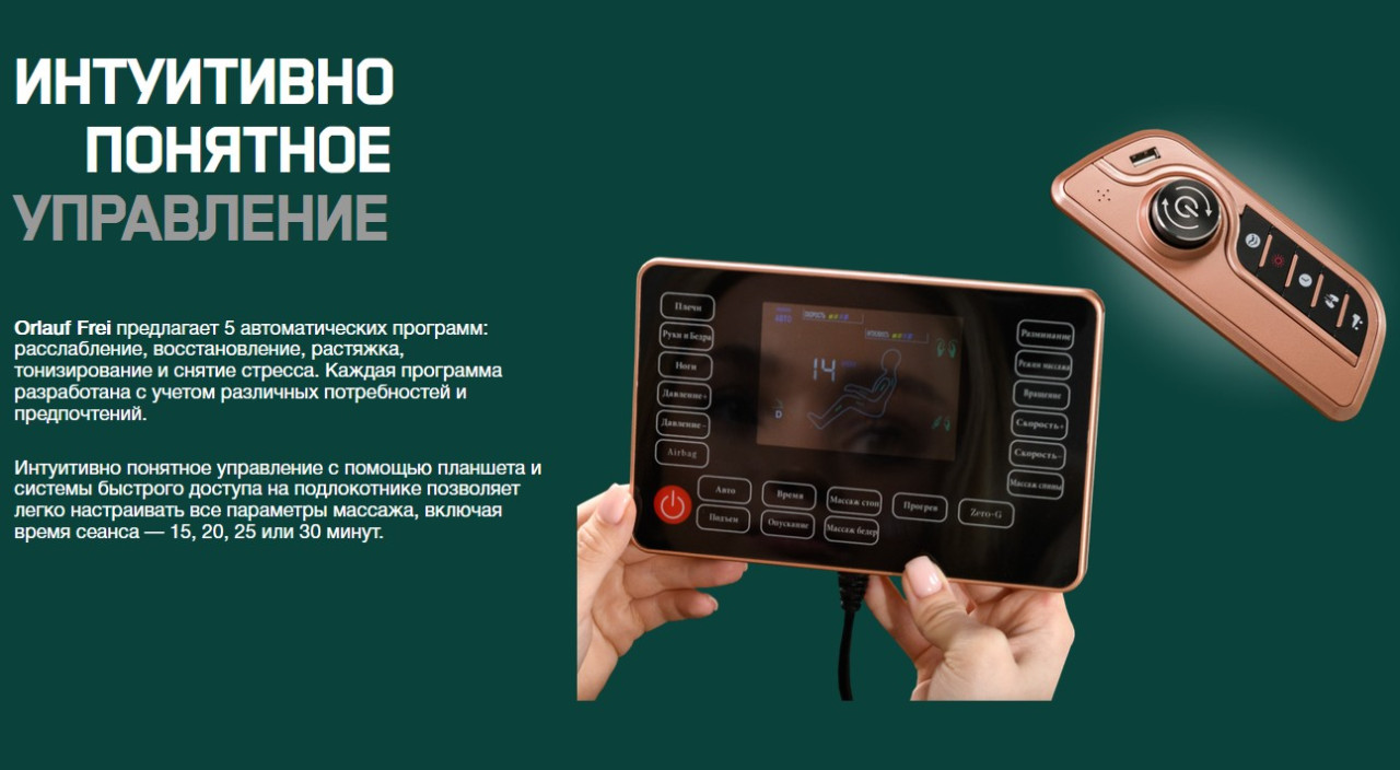 Исследуйте уникальный опыт Zero-G, где ваше тело находит идеальное положение для наилучшего массажа. В этом положении спина освобождается от давления, что делает массаж более уютным и приятным. Комплексный воздействие на тело создается системой воздушного компрессионного массажа с 21 подушкой. 48 роликов в области ног гармонично сочетаются с 18 основными подушками, дополненными специальными для головы и бедер. Мощная система из 22 роликов, объединенных в 8 групп, обеспечивает глубокий и точный массаж каждой зоны. Разнообразные режимы скорости вращения и возможность выбора направления движения роликов позволяют настроить идеальный массаж под ваши потребности. Идеальным решением для даже небольших помещений является Orlauf Frei с инновационной системой Smart-Slide. Открыв новые возможности для организации пространства, возможность размещения кресла всего в 20 сантиметрах от стены не жертвует функциональностью и комфортом. Подножка с регулировкой высоты на 10 сантиметров адаптируется под ваш рост, обеспечивая идеальное положение ног во время массажа. С продуманной конструкцией, пользователи ростом до 190 сантиметров и весом до 150 килограммов смогут разместиться с комфортом. Разнообразные техники массажа предлагаются в рамках 5 автоматических программ, которые обеспечивают разнообразные воздействия в зависимости от предпочтений. Персонализированный массаж возможен благодаря ручной настройке параметров, выбору времени сеанса от 15 до 30 минут и определению интенсивности работы каждого элемента массажного стула. Специальные обмотки для массажа бедер и дополнительные ролики для ягодичной зоны улучшают эффективность процедуры, делая ее более комплексной. Такое сочетание различных методов массажа обеспечивает полноценное воздействие на все группы мышц. Настоящее произведение искусства - кресло Orlauf Frei с изысканной отделкой из износостойкого материала Abriebfest в цвете Oat Oasis. Вся конструкция кресла продумана с учетом комфорта и эстетики, делая его идеальным выбором. Интуитивное и комфортное управление креслом обеспечивается удобной подставкой для телефона с кнопками быстрого доступа. Необходимые настройки массажа можно менять без прерывания процесса благодаря этой инновационной системе. Bluetooth-колонки, встроенные в кресло, создают уникальную атмосферу во время массажа, позволяя наслаждаться музыкой. Прогрев поясницы и икр усиливает терапевтический эффект, способствуя расслаблению мышц и улучшению кровообращения.*ХарактеристикиСтрана БрендаГермания ?Нагрузка кг.Максимальный вес который может выдержать изделие150 ?Количество программФункция личного тренера, которая изменяет нагрузку и другие параметры для наибольшего эффекта5 ДисплейЕсть ?Тип массажного креслаУниверсальные кресла обладают широким функционалом различных видов массажа;Кресла-качалки обладают механизмом качания;Вибромассажные обладают только одним видом массажа - вибромассаж;Массажная накидка это аксессуар на кресло с функциями массажаУниверсальное Вид массажного креслаДля дома Показания компьютерарегулировка интенсивности массажа, программы, выбор зоны массажа, регулировка кресла, подогрев Вид массажаВоздушно-компрессионный, Релакс, Роликовый Зоны массажаБедра, Голова, Икры, Кисти, Плечи, Поясница, Руки, Спина, Ступни, Шея, Ягодицы Функция подогреваИ