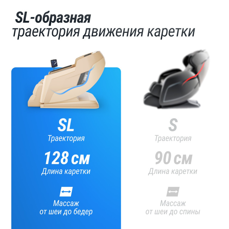 В массажном кресле UNIX Med Afelia имеется функция роликового массажа для ног и икроножных мышц, а также воздушно-компрессионные подушки, которые адаптируются под форму тела пользователя для быстрого снятия мышечного напряжения. Автоматически выдвигаемая подставка для ног и ролики для массажа стопы помогут расслабиться после напряженного дня. Кресло оснащено SL-образной кареткой длиной 128 см, которая охватывает область от шеи до бедер, обеспечивая полноценный массаж. Для более глубокого массажа рекомендуется использовать SL-образную каретку. Эта каретка охватывает больше частей тела и оснащена роликами, движущимися от шеи до бедер. При этом интенсивность массажа зависит от длины каретки. После процедуры от шеи до бедер и ягодиц вы почувствуете полное расслабление мышц и насладитесь всем многообразием массажа. На подлокотнике установлен удобный пульт управления в виде планшета, который позволяет легко контролировать все функции. Возможности массажного кресла включают в себя регулировку программ и интенсивности массажа, а также положение для ног и спинки. Также имеется функция памяти для двух пользователей, которая сохраняет предпочтительные положения массажера для плеч, интенсивность массажа и положение массажера для икроножных мышц. В меню есть опции для настройки подогрева, роликовых массажеров, яркости экрана, времени, языка и отображения состояния.