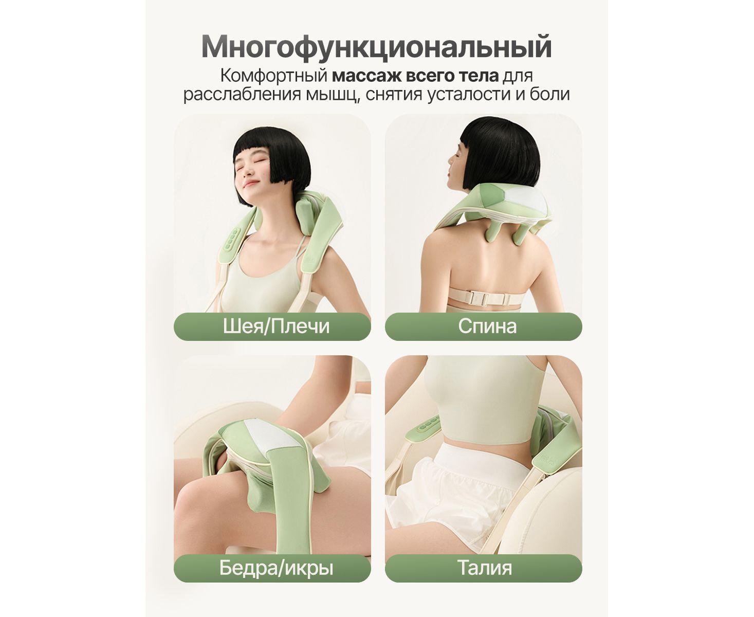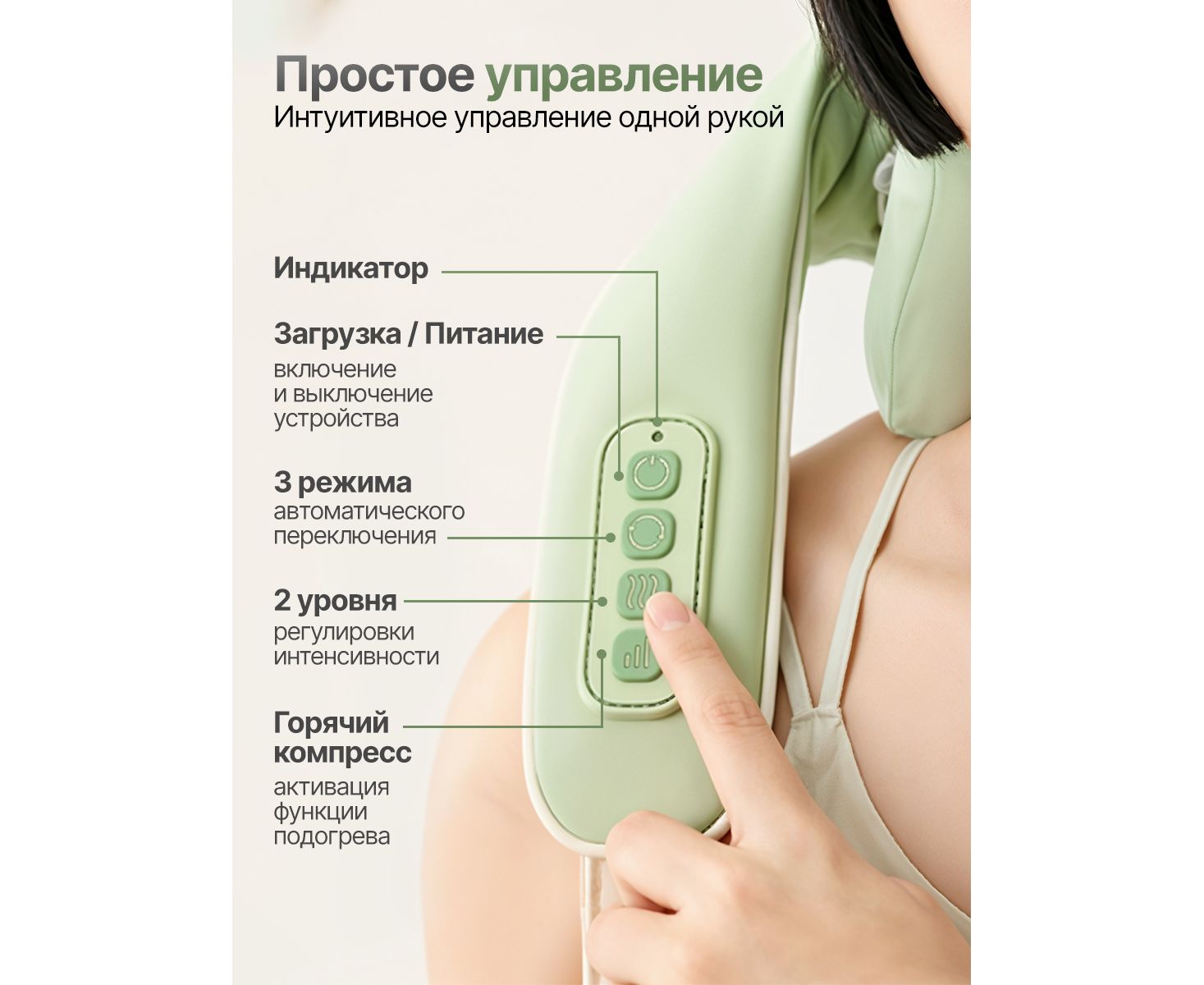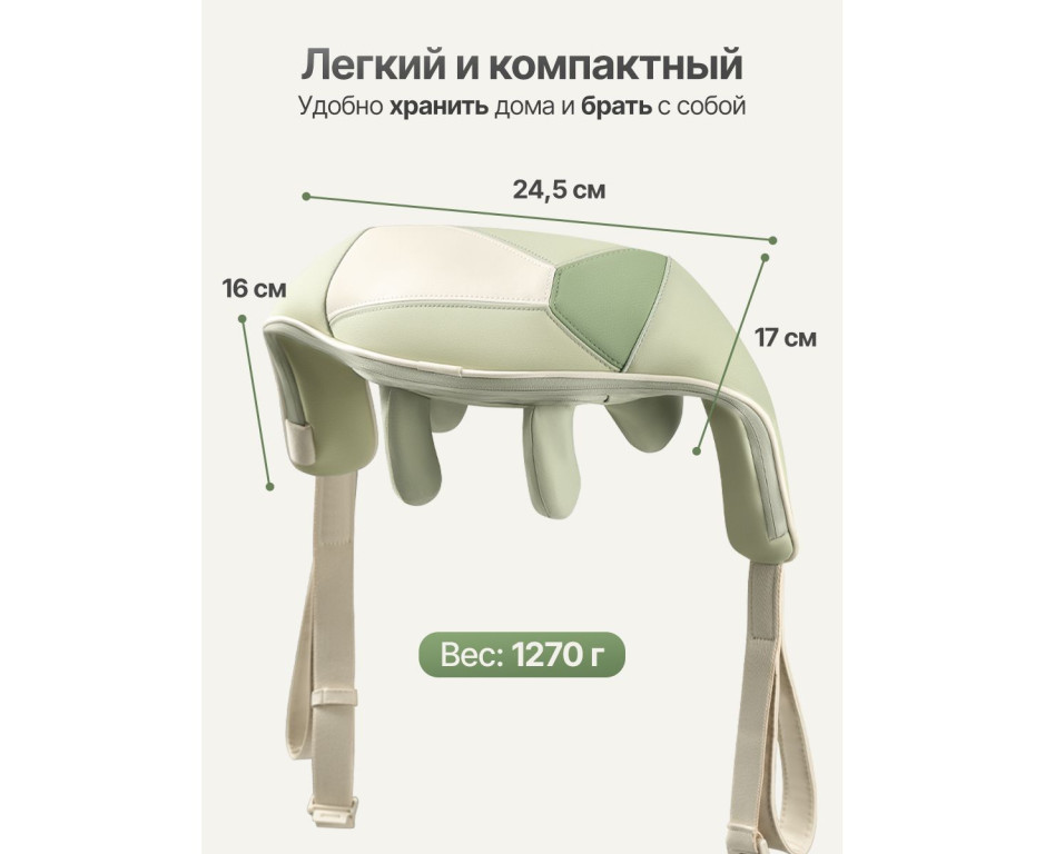 Вибромассажер DFC LAZYCLOUD VM-MA36 зелёного цвета — это беспроводное устройство для расслабления мышц плечевого пояса, шеи и спины после рабочего дня или тренировок. Модель сочетает в себе технологии вибрации, прогрева и эргономичный дизайн.