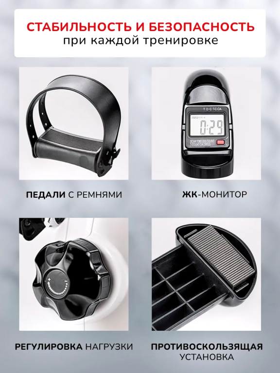 Велотренажер напольный мини домашний MC03 — отличный тренажер для рук и ног, который всегда под рукой, готовый помочь вам достичь ваших фитнес-целей в любое время. Этот компактный и стильный велотренажер для дома идеально подходит для использования в домашних условиях, особенно если у вас ограниченное пространство. Тренажер для кардио имеет эргономичный дизайн позволяет легко разместить его в любой комнате, будь то гостиная, спальня или даже офис. Одной из ключевых особенностей кардиотренажер для ног и рук MC03 является его удобный ЖК-монитор с крупными символами, который обеспечивает легкость в использовании и доступность информации. Вы сможете без труда отслеживать все важные параметры вашей тренировки: время, пройденную дистанцию, количество оборотов и потраченные калории. Это позволит вам более эффективно планировать свои занятия и видеть прогресс, что, в свою очередь, станет отличной мотивацией для достижения новых высот. Тренажер велосипед MC03 разработан с учетом всех современных требований к домашнему фитнес-оборудованию. Он обеспечивает плавный и тихий ход, что делает тренировки комфортными и ненавязчивыми для окружающих. Вы можете заниматься в любое время дня и ночи, не беспокоясь о том, что помешаете своим близким или соседям. Кроме того, тренажер для ног педали MC03 отличается простотой в сборке и эксплуатации. Вам не потребуется специальных навыков или инструментов, чтобы начать использовать его. Просто установите тренажер в удобном для вас месте, настройте параметры и приступайте к тренировке. Его прочная конструкция гарантирует долговечность и надежность, а также безопасность во время занятий. Этот тренажер для похудения подходит для людей любого уровня физической подготовки. Независимо от того, являетесь ли вы новичком или опытным спортсменом, вы сможете настроить интенсивность тренировки в соответствии с вашими потребностями и возможностями.