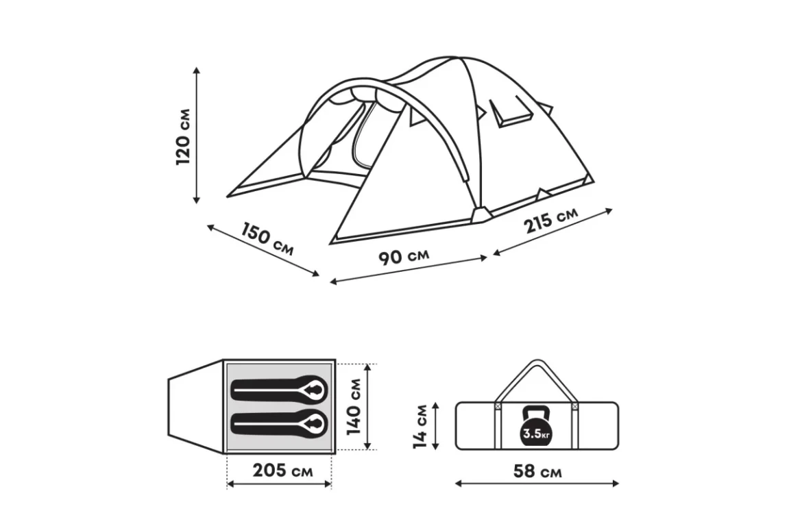 Палатка двухслойная, что обеспечивает хорошую вентиляцию, предотвращает образование конденсата и создает дополнительную защиту от насекомых. Тент выполнен из полиэстера 190T 63D с водонепроницаемостью 4000 мм, дно из армированного полиэтилена (терпаулинга) с водонепроницаемостью 10000 мм. Каркас собран из фиберглассовых дуг с металлическими наконечниками.