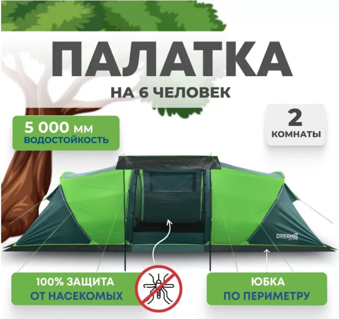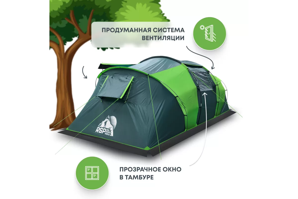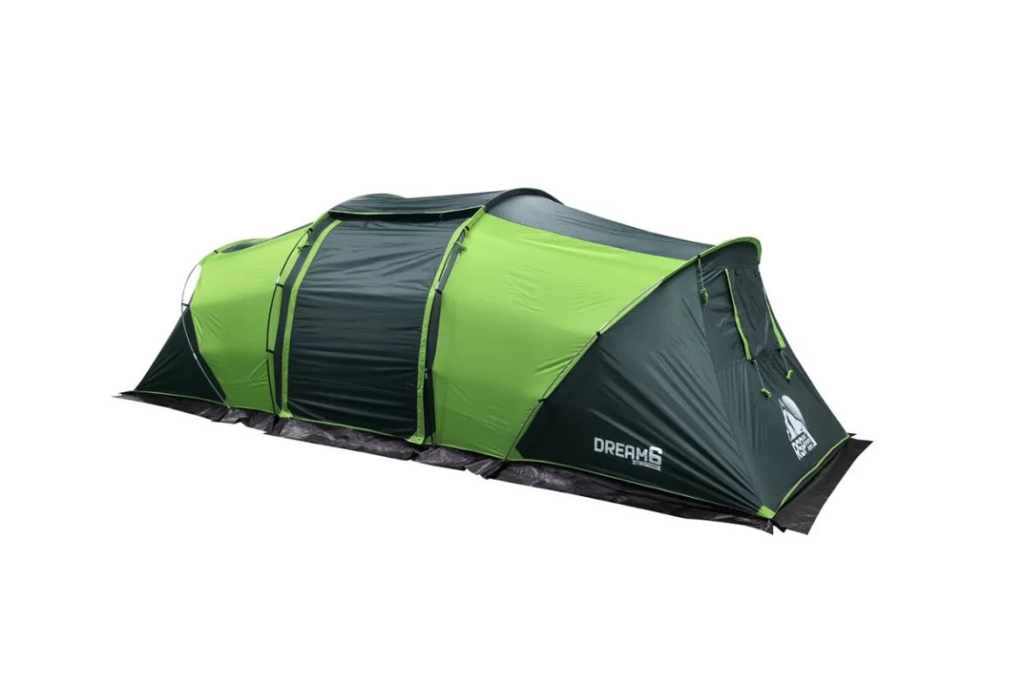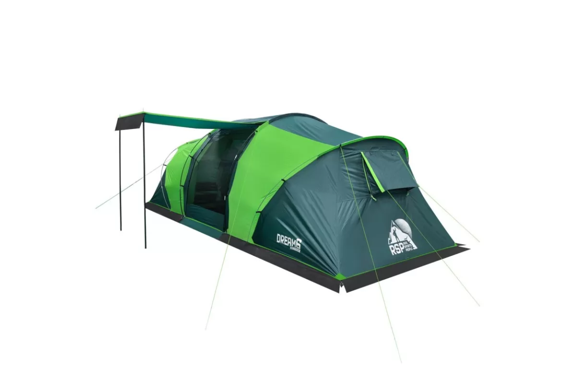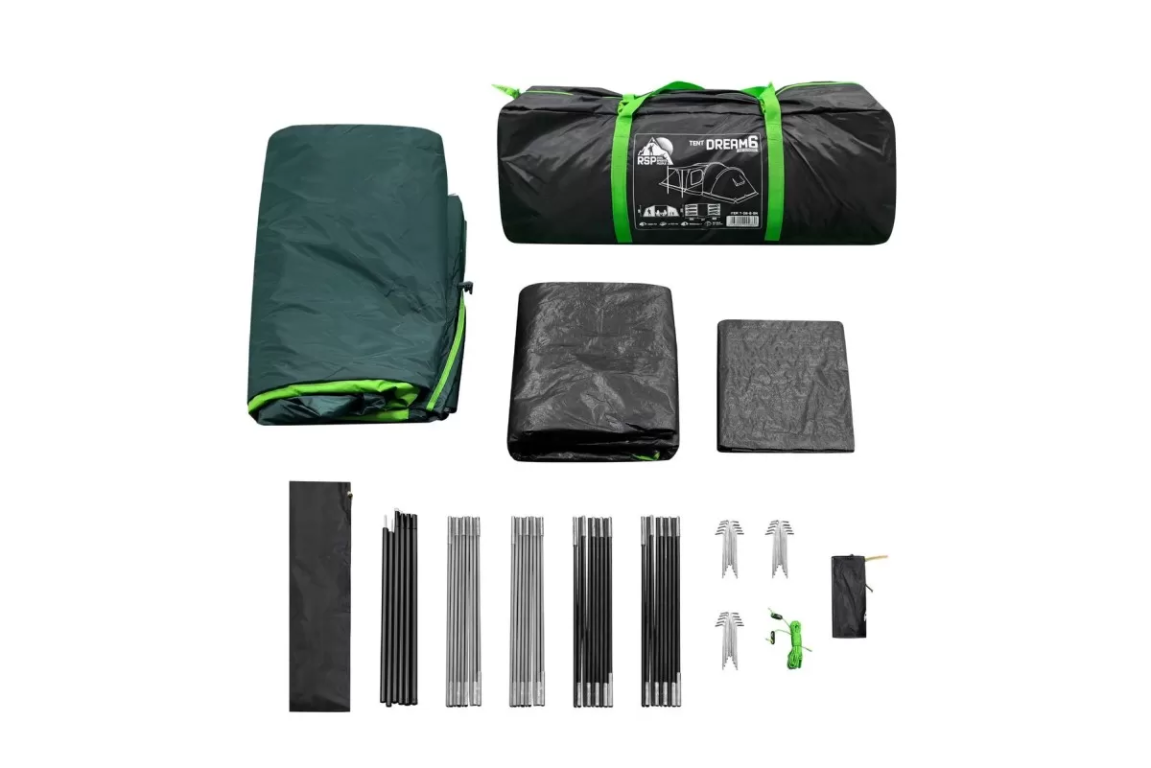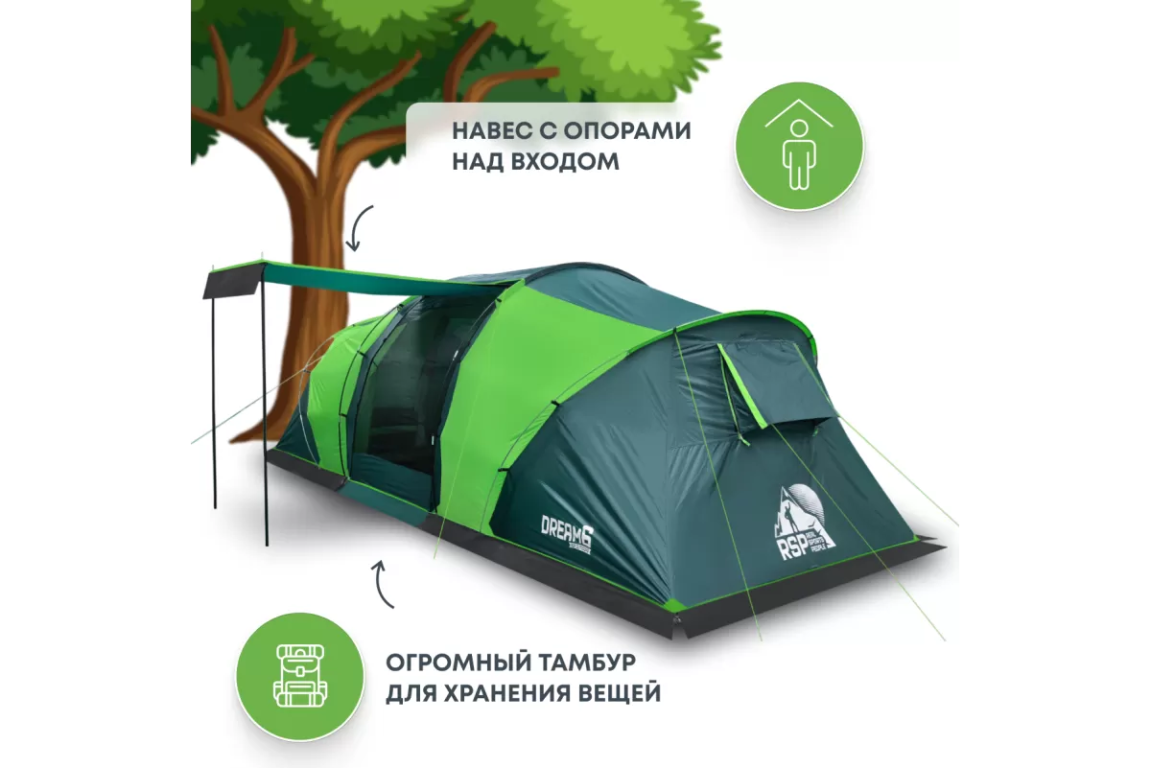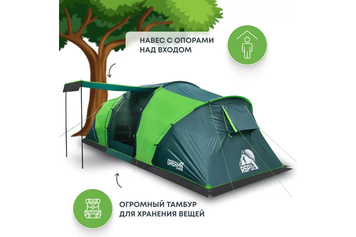 Если вы ищете палатку для долгих стоянок на природе — присмотритесь к RSP Dream 6. Шесть спальных мест, два отдельных спальных отсека и здоровенный тамбур посередине. Тамбур, кстати, не для галочки: 160 на 230 см при высоте почти два метра (195 см) — сюда влезет складной столик, стулья, и ещё куча барахла по углам. Вечером можно сидеть внутри компанией и не упираться головой в потолок.