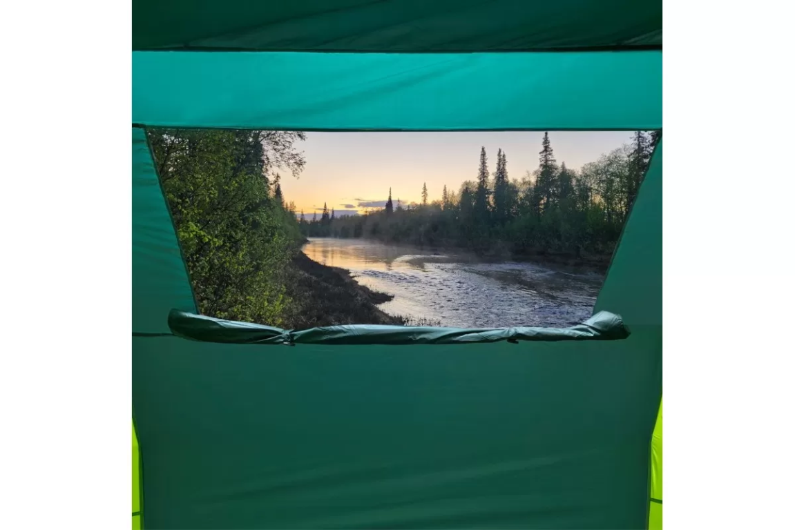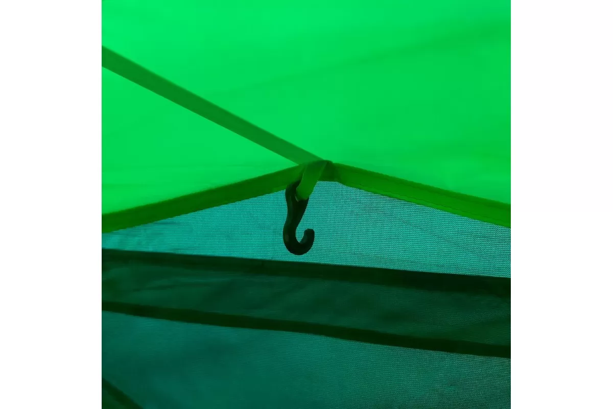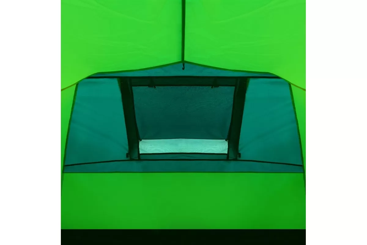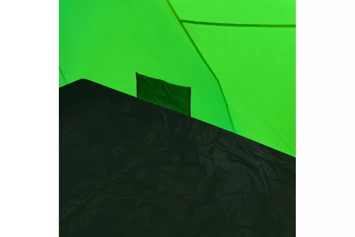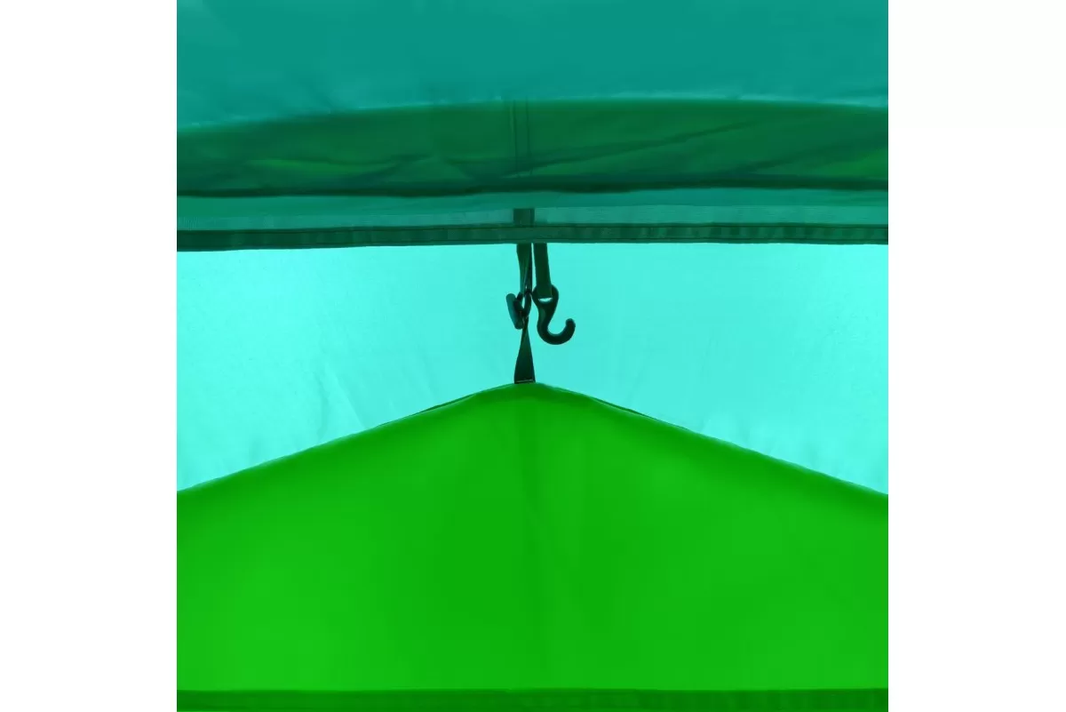 Наружный тент — Polyester 210T 68D, водостойкость 5000 мм. Проще говоря, можно спокойно пережидать многочасовой дождь и не переживать за протечки. Дно — Tarpauling, водостойкость уже 10 000 мм. Материал плотный, но не дубовый — нормально складывается и весит адекватно. Каждый шов и каждая молния закрыты термоусадочной лентой, так что слабых мест для воды просто нет. Скелет палатки — фиберглассовые дуги 9,5 мм и 11 мм, на концах металлические наконечники. Гнутся нормально, при этом сломать их сложно. Плюс в комплекте штормовые оттяжки со светоотражающей нитью — и палатку держат крепче, и в темноте о них не споткнёшься. Двойные стенки решают сразу две задачи: воздух между слоями не даёт копиться конденсату, а внутри поддерживается нормальный микроклимат. Ещё один плюс — при установке сначала натягивается внешний тент. То есть если зарядил дождь, можно спокойно собирать палатку, не боясь намочить спальню изнутри.