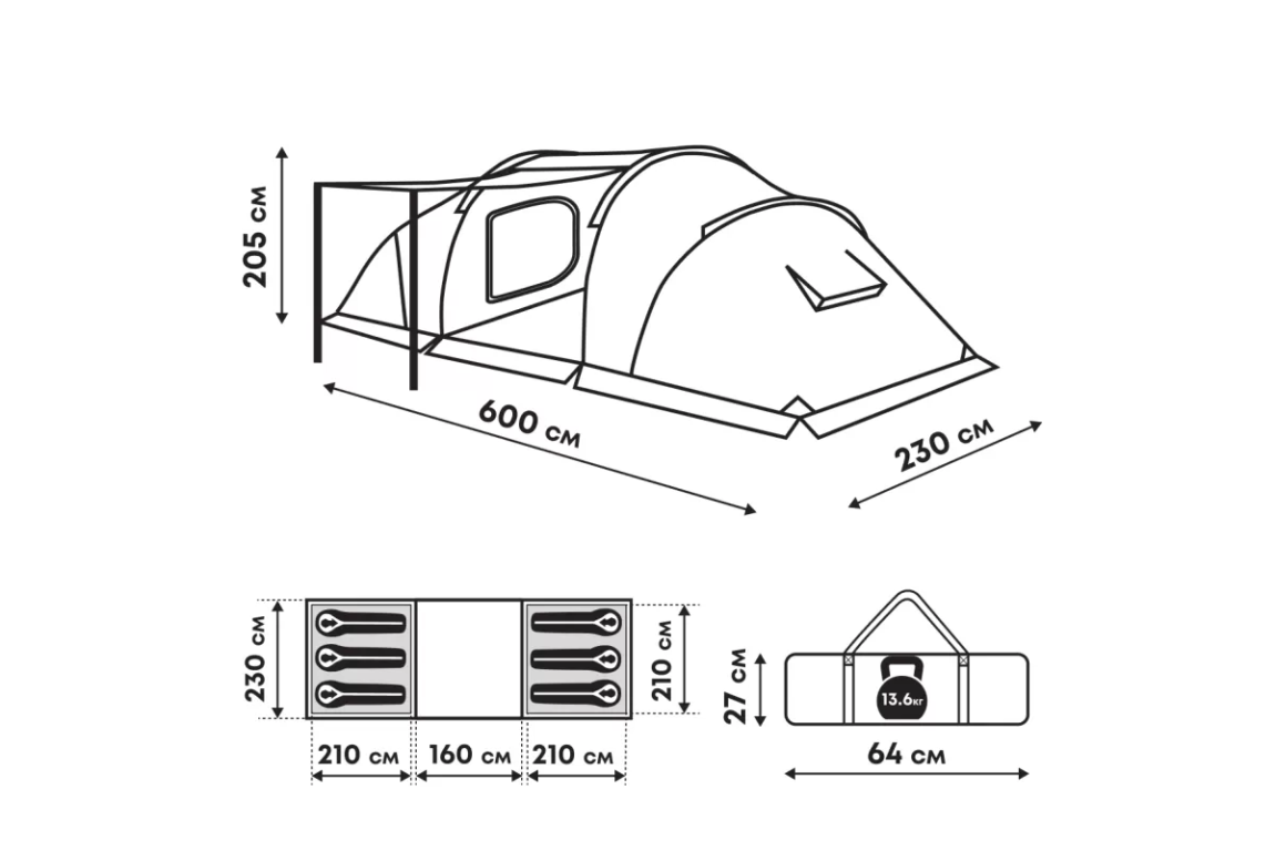 Компоновка простая и удобная: заходишь — попадаешь в тамбур, налево и направо — спальни по три места. В тамбуре стоит прозрачное окошко, которое при желании закрывается шторкой. На полу — съёмная подстилка. Входную дверь можно откинуть вверх и поставить на стальные стойки из комплекта — получается козырёк от солнца и дождя. Вход затянут москитной сеткой, а снизу по всему периметру идёт тканевая юбка — мошкара и комары остаются снаружи.ХарактеристикиТипПалатка Видкемпинговая Страна БрендаКитай Материалa:3:{s:5:"VALUE";a:0:{}s:11:"DESCRIPTION";a:0:{}s:2:"ID";a:0:{}} Материал тентаПолиэстер 210T 68D Кол-во мест6 ?Влагостойкость, ммЧем выше значение, тем влагостойкость выше5000 ?Влагостойкость дна, ммЧем выше значение, тем влагостойкость выше10000 Сезонвесна, лето, осень ?Кол-во слоевВ двухслойной выше влагостойкость и теплоизоляция2 Швыпроклеенные ?Быстрая сборкаПозволяет собрать палатку за несколько минут, значительно быстрее обычныхНет ТамбурЕсть ОкноЕсть с вентиляцией Противомоскитная сеткаЕсть Количество входов2 Количество тамбуров1 Штормовые оттяжкиЕсть Ветрозащитная юбкаНет Дуги9.5 и 11мм Ткань внутренняяПолиэстер Размер спального места230*210 + 210*210см Материал каркасафибергласс Материал днатерпаулинг Габариты230х205х600 см Размер упаковки в см (Д*Ш*В)64х27х27 см Вес в упаковке кг13.6 Гарантия1 год ЦветЗеленый ПроизводительHEFEI DAYU FITNESS CO. LTD. Адрес производителя: No.1, Zhanxi Road, Hefei,China ИмпортерООО "МеталапошукБай" Минский рн., аг.Озерцо, Меньковский тракт, д.2, пом.7 -