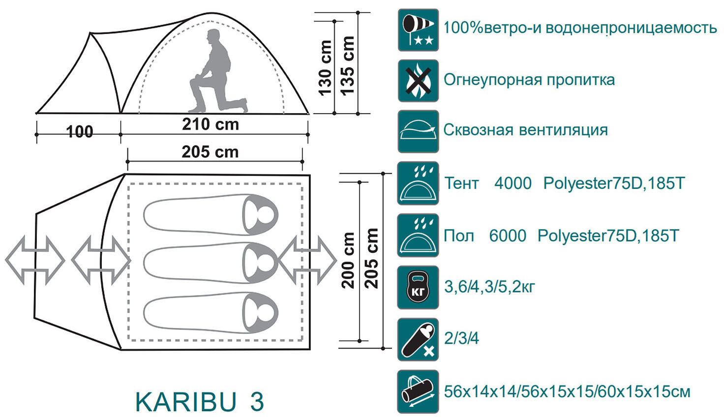 Серия Canadian Camper KARIBU — это классические туристические палатки с тамбуром на 2, 3 и 4 человека. Продуманная конструкция и компактные размеры в сложенном виде делают их удобными как для кемпинга, так и для походов. Главная особенность моделей — увеличенный тамбур за счёт дополнительной П-образной дуги, где легко разместить вещи и комфортно заходить внутрь. Палатки оснащены двумя входами, окнами с противомоскитными сетками и вентиляционными отверстиями — это обеспечивает хороший приток воздуха и защиту от насекомых. Ветрозащитная юбка по периметру повышает устойчивость к непогоде, а тент из водонепроницаемой ткани с огнеупорной пропиткой и проклеенными швами надёжно защищает от дождя.ХарактеристикиТип