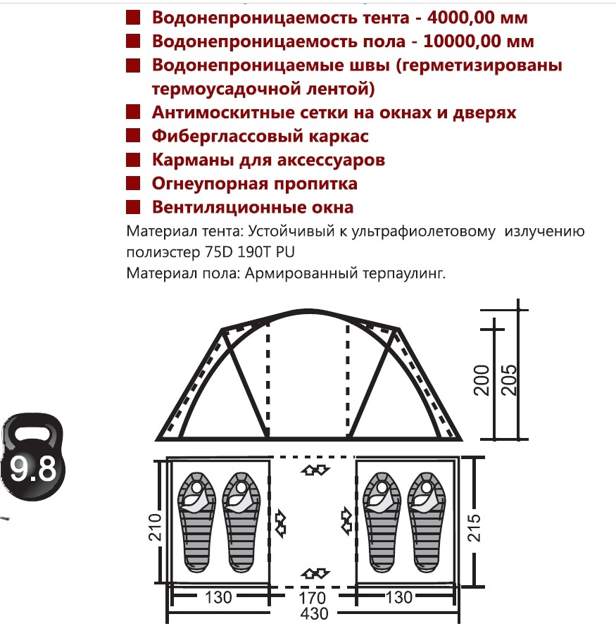 Палатка Видтреккинговая Страна БрендаКитай МатериалПолиэстер (75D 190T PU) Материал тентаПолиэстер (75D 190T PU) Кол-во мест4 ?Влагостойкость, ммЧем выше значение, тем влагостойкость выше4000 ?Влагостойкость дна, ммЧем выше значение, тем влагостойкость выше10000 Сезонвесна, лето, осень ?Кол-во слоевВ двухслойной выше влагостойкость и теплоизоляция2 Швыпроклеенные ?Быстрая сборкаПозволяет собрать палатку за несколько минут, значительно быстрее обычныхНет ТамбурЕсть ОкноЕсть Противомоскитная сеткаЕсть Количество входов2 Количество тамбуров1 Штормовые оттяжкиЕсть Ветрозащитная юбкаНет Дуги9.8 Ткань внутренняяПолиэстер (75D 190T PU) Размер спального места220х140х195 см Материал каркасафибергласс, сталь Материал днаПолиэстер (75D 180T PU) Габариты430х215х205 см Размер упаковки в см (Д*Ш*В)70x22x22 см Вес в упаковке кг9.8 Гарантия1 год ЦветЗеленый ПроизводительКитай ИмпортерООО "Централ Спорт" г. Минск 220012, ул.Чернышевского 8 каб. 23 -