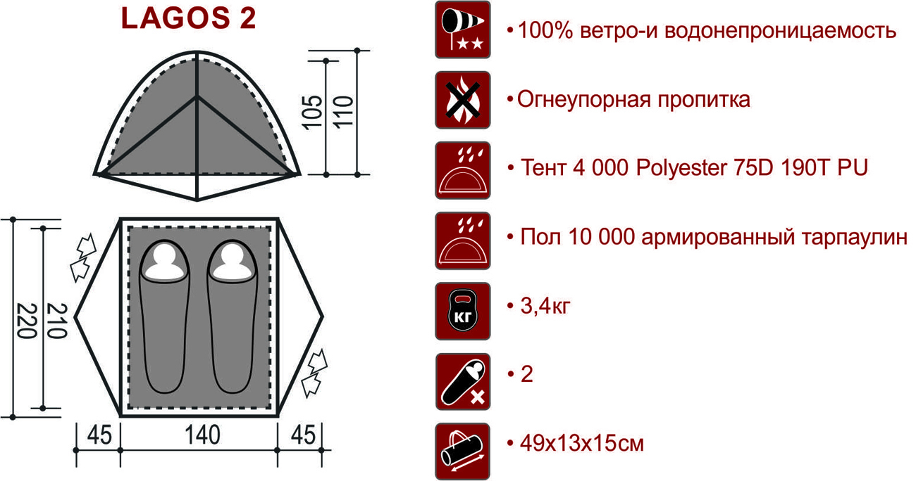 Палатка Indiana Lagos 2 — это доступная и лёгкая модель, которую часто выбирают для непродолжительных пеших или велосипедных походов. Она даёт хорошее соотношение цены и качества, поэтому особенно подходит начинающим туристам. При малом весе палатка обеспечивает комфортабельный отдых и не нагружает рюкзак.ХарактеристикиТип