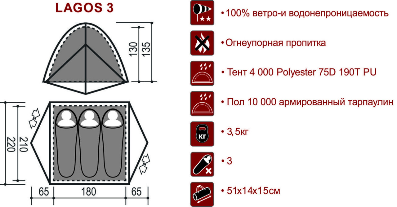 Палатка Indiana Lagos 3 — это доступная и лёгкая модель, которую часто выбирают для непродолжительных пеших или велосипедных походов. Она даёт хорошее соотношение цены и качества, поэтому особенно подходит начинающим туристам. При малом весе палатка обеспечивает комфортабельный отдых и не перегружает рюкзак.ХарактеристикиТип