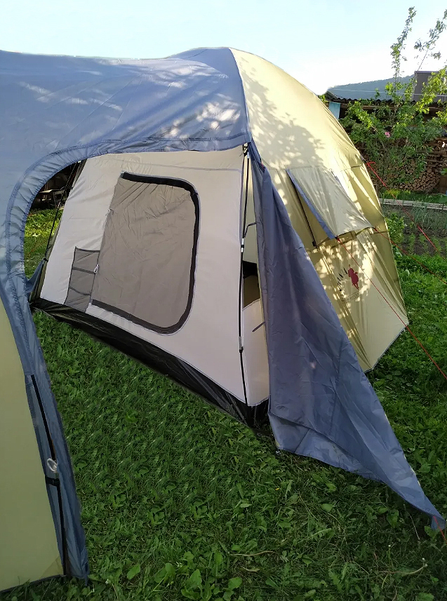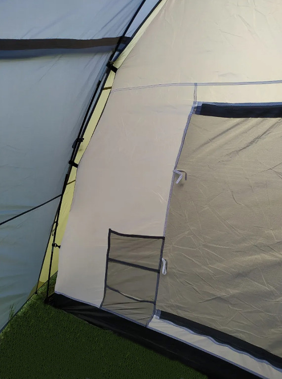 Вентиляция продумана через габаритные карманы, так что палатка хорошо продувается. На каждом входе и вентиляционном окне установлены москитные сетки. Внутренняя палатка сшита из дышащего полиэстера, а внешний тент выполнен из влагонепроницаемой ткани. Несмотря на большие габариты, палатка не громоздкая и заметно легче многих аналогов своего класса.