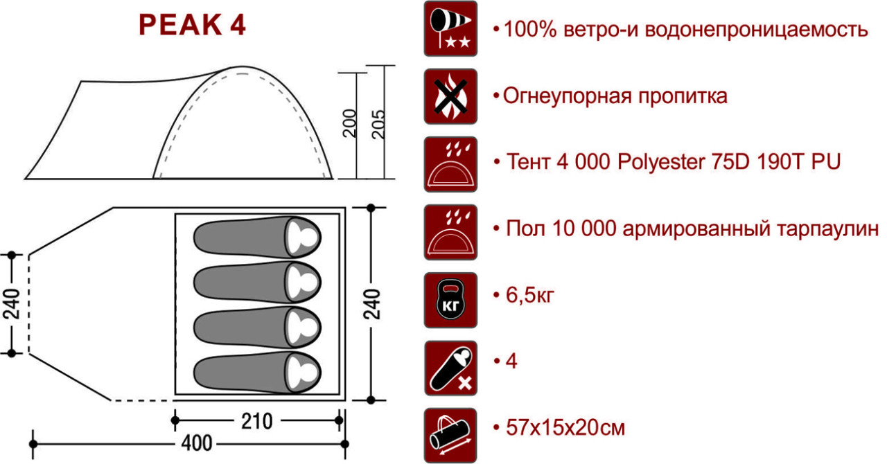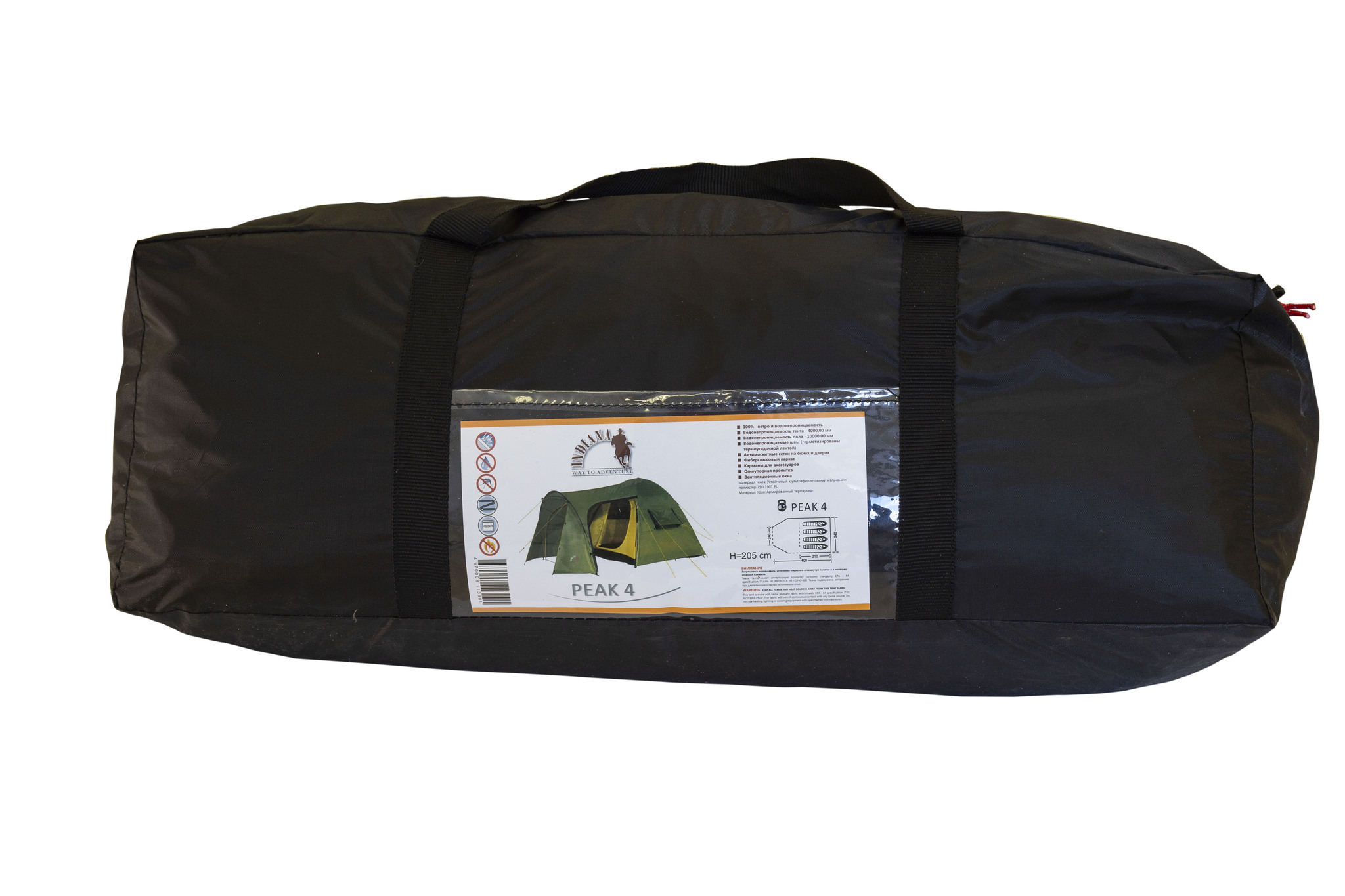 Каркас из стеклопластика и огнеупорная пропитка материалов добавляют безопасности. Форма полусферы выбрана не случайно: она не позволяет воде скапливаться на крыше во время дождя и препятствует затеканию воды под дно. Indiana Peak 4 отлично подходит для длительных пикников, палаточных лагерей и выездов на природу с семьёй или друзьями.ХарактеристикиТипПалатка Видтреккинговая Страна БрендаКитай МатериалПолиэстер (75D 190T PU) Материал тентаПолиэстер (75D 190T PU) Кол-во мест4 ?Влагостойкость, ммЧем выше значение, тем влагостойкость выше4000 ?Влагостойкость дна, ммЧем выше значение, тем влагостойкость выше10000 Сезонвесна, лето, осень ?Кол-во слоевВ двухслойной выше влагостойкость и теплоизоляция2 Швыпроклеенные ?Быстрая сборкаПозволяет собрать палатку за несколько минут, значительно быстрее обычныхНет ТамбурЕсть ОкноЕсть Противомоскитная сеткаЕсть Количество входов3 Количество тамбуров1 Штормовые оттяжкиЕсть Ветрозащитная юбкаНет Дуги9.5 Ткань внутренняяПолиэстер (75D 190T PU) Размер спального места240х210х200 см Материал каркасафибергласс, сталь Материал днаПолиэтилен (армированный тарпаулин) Габариты400х240х205 см Размер упаковки в см (Д*Ш*В)57х20х15 Вес в упаковке кг6.7 Гарантия1 год ЦветСерый ПроизводительКитай ИмпортерООО "Централ Спорт" г. Минск 220012, ул.Чернышевского 8 каб. 23 -