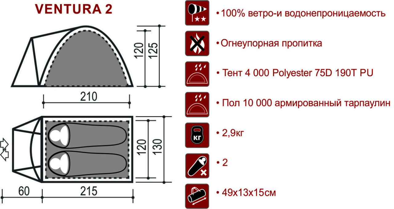 Палатка Indiana Ventura 2 рассчитана на двух человек, но при желании её можно использовать как одноместную — тогда внутри будет особенно просторно и комфортно. Модель оснащена небольшим тамбуром, где удобно хранить рюкзаки и обувь, а два смотровых окна в тамбуре обеспечивают дополнительный свет и обзор. Палатка двухслойная: внутренняя часть выполнена из дышащей ткани, благодаря чему конденсат внутри не скапливается. Для вентиляции в спальном отделении предусмотрены два окошка на крыше.ХарактеристикиТип