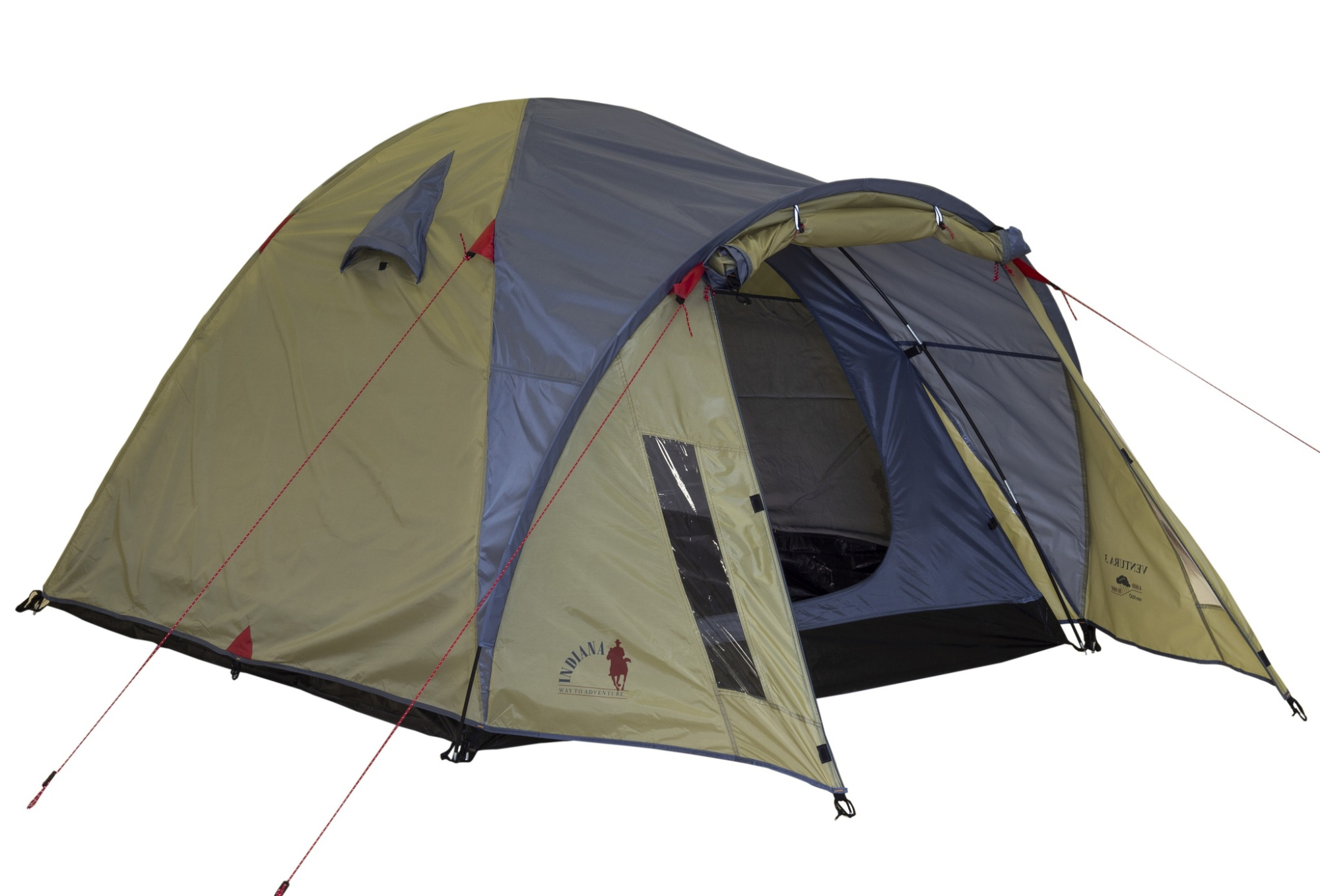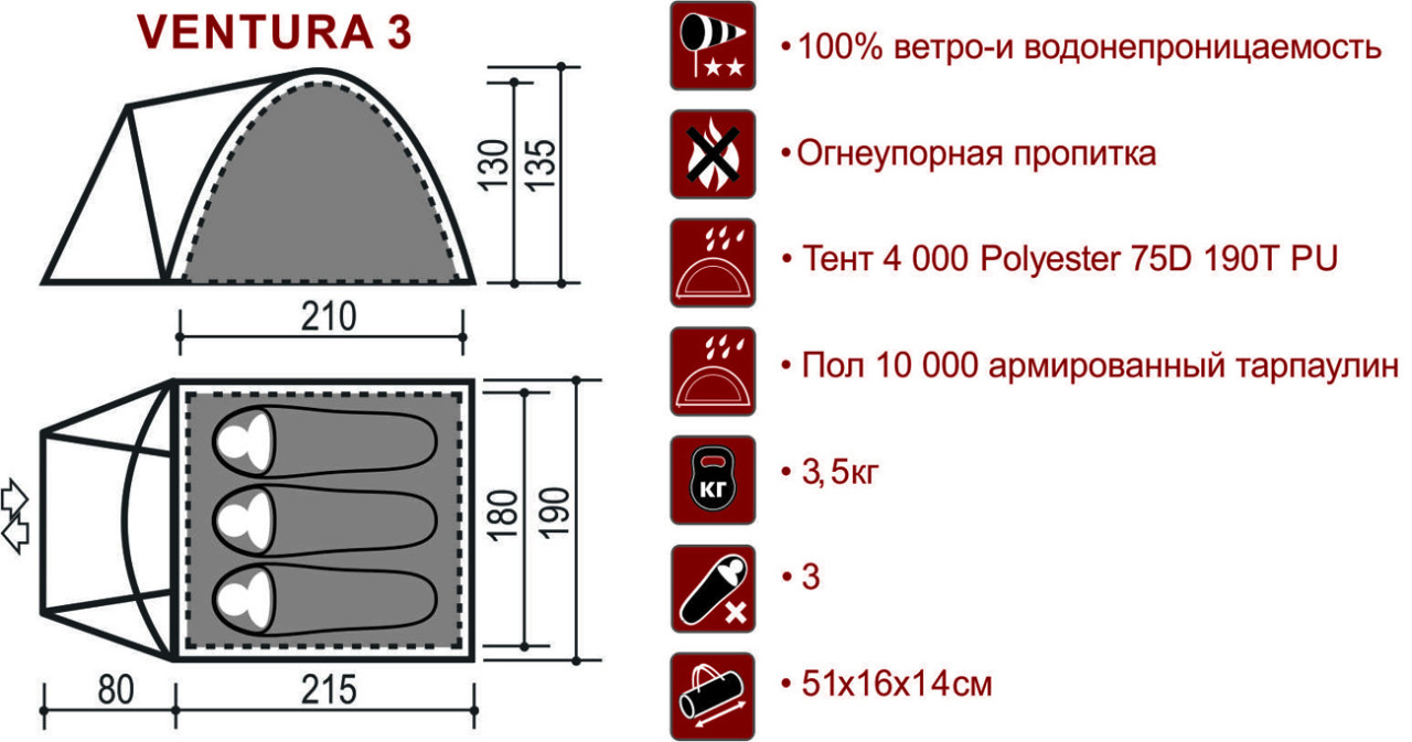 Палатка Indiana Ventura 3 рассчитана на троих, но с комфортом разместит и двоих, если хочется больше пространства. У неё есть небольшой, но удобный тамбур — рюкзаки и обувь спокойно поместятся, а два смотровых окошка добавляют света и позволяют видеть, что снаружи. Палатка двухслойная: внутренний слой из дышащей ткани, так что про конденсат можно забыть. Для свежего воздуха в спальнике предусмотрены два вентиляционных окна на крыше.ХарактеристикиТип
