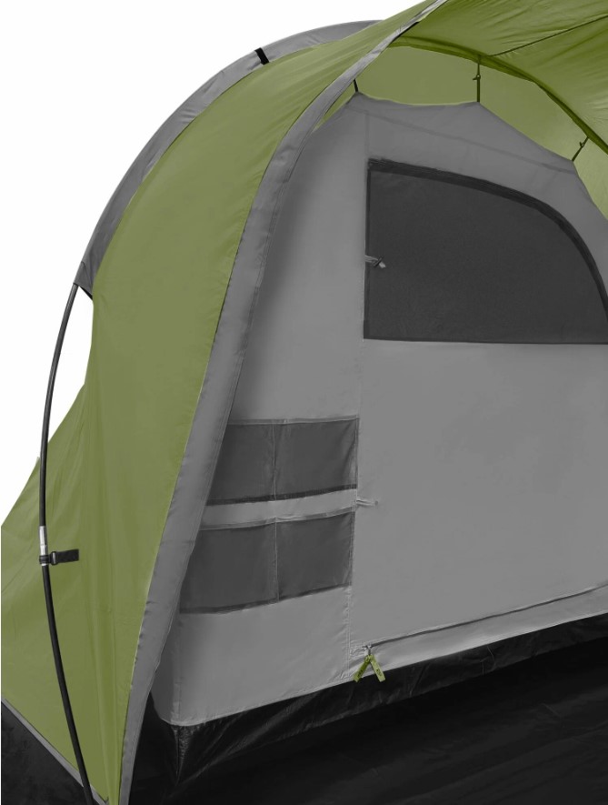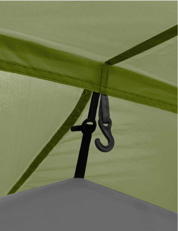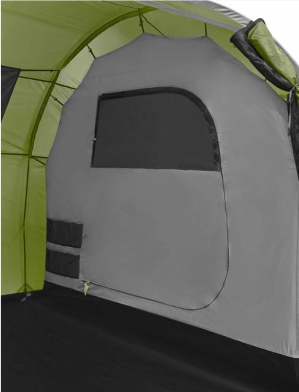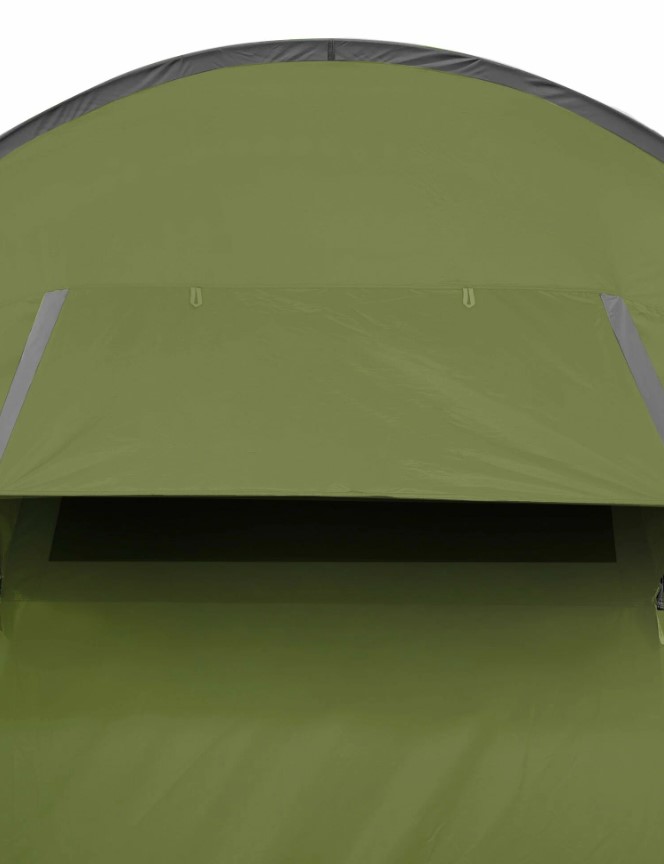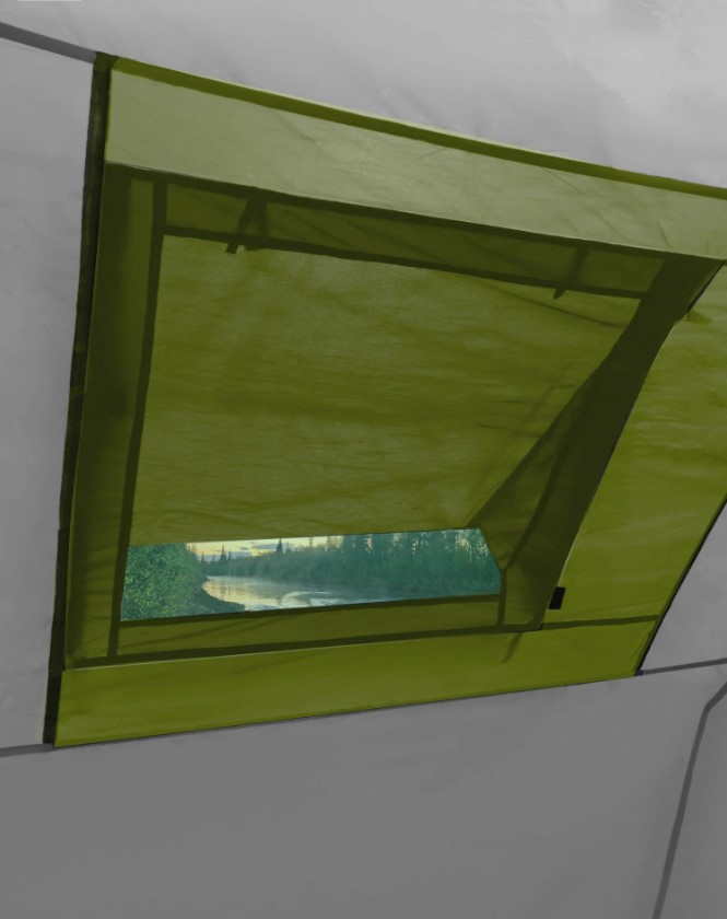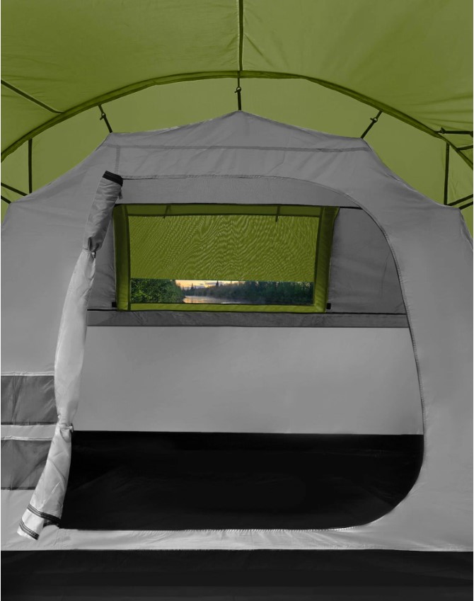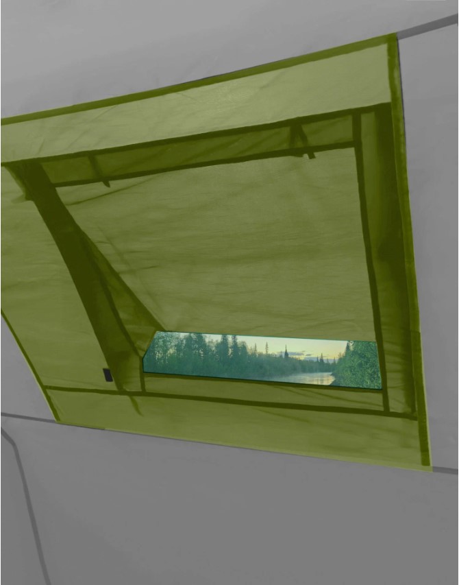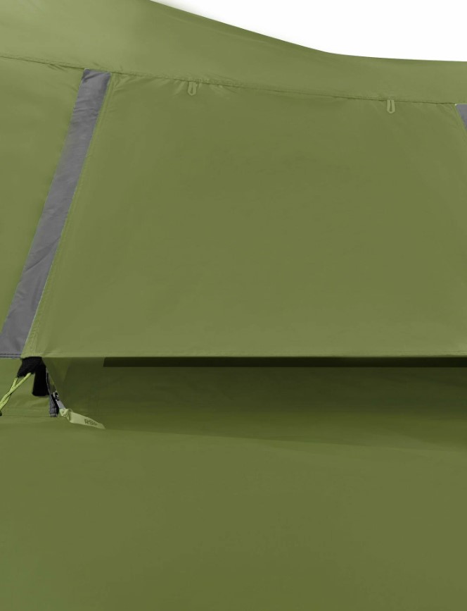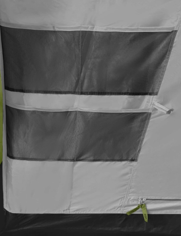 Защита от насекомых продумана серьёзно: по периметру пришита юбка, вход в тамбур двойной (водонепроницаемая дверь + москитная сетка), двери в спальни тоже с сетками. Три вентиляционных клапана с регулировкой и москитными сетками позволяют поддерживать комфортный микроклимат при любой погоде. Москитная сетка марки B3 — мелкоячеистая, не пропускает даже мелкую мошку.