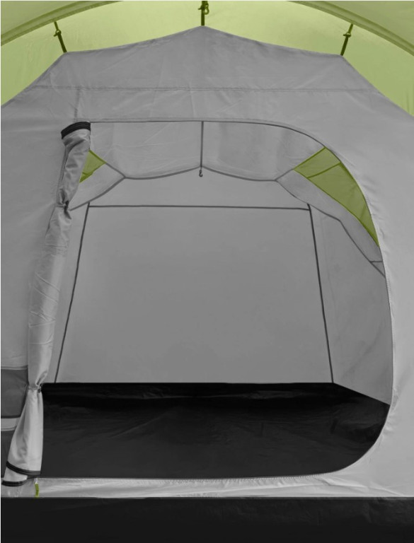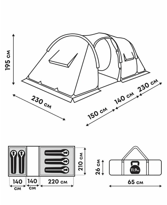 Конструкция туннельная — дуги расположены параллельно, что упрощает сборку и даёт больше внутреннего объёма по сравнению с купольными моделями. Сначала устанавливается внешний тент, так что даже в дождь спальники останутся сухими. Высота в тамбуре достигает 190 см — можно спокойно стоять в полный рост.