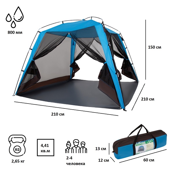 Установка не занимает много времени, небольшой вес делает палатку удобной для транспортировки. Внутри предусмотрены москитные сетки, которые защищают от насекомых и обеспечивают вентиляцию.ХарактеристикиТипПалатка-шатер Видтуристическая Страна БрендаКитай Форманестандартная ДополнительноКолышки для фиксации шатра в земле, Боковые растяжки для устойчивости, Карманы для песка МатериалДуги: стеклопластик Материал тента180Т полиэстер КомплектацияТент, Сумка Тип соединения панелейконнекторы стальные ?Влагостойкость, ммЧем выше значение, тем влагостойкость выше800 ?Быстрая сборкаПозволяет собрать палатку за несколько минут, значительно быстрее обычныхНет Дуги8,5 мм Ткань внутренняя180Т полиэстер ОсобенностьДвери и сетка на молнии, Регулировка натяжения ножек Каркас11 мм, 9,5 мм Материал куполаполиэстер 190T с полиуретановым покрытием 1000 мм Габариты210х210х150 см Размер165х165х200 см Размер упаковки в см (Д*Ш*В)59х18х14 см Размер в сложенном виде64x10x13 см Вес изделия кг1.4 Вес в упаковке кг2.7 Гарантия6 мес. ЦветГолубой, Черный ПроизводительZHEJIANG SHANGDE INDUSTRY&TRADE CO.,LTD ИмпортерООО "Централ Спорт" г. Минск 220012, ул.Чернышевского 8 каб. 23 -