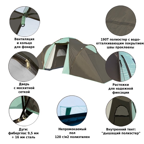 Палатка Green Glade Konda 4 — четырехместная модель с двумя раздельными комнатами и двумя входами. Внутри предусмотрен большой защищенный тамбур.