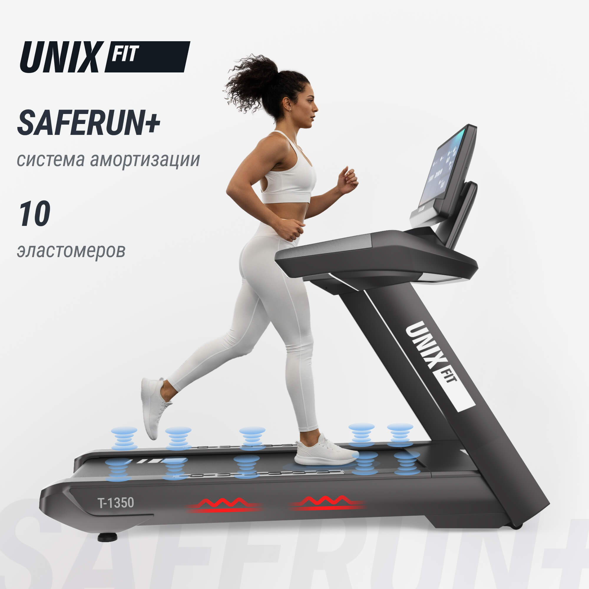 Комфорт и безопасность обеспечивает широкое беговое полотно коммерческого класса размером 158 х 58 см с толщиной 3 мм. Ортопедическая система амортизации SAFERUN+ с 10 эластомерами и ребристой поверхностью полотна эффективно поглощает ударную нагрузку, минимизируя воздействие на суставы и позвоночник, а также гарантирует надежное сцепление.