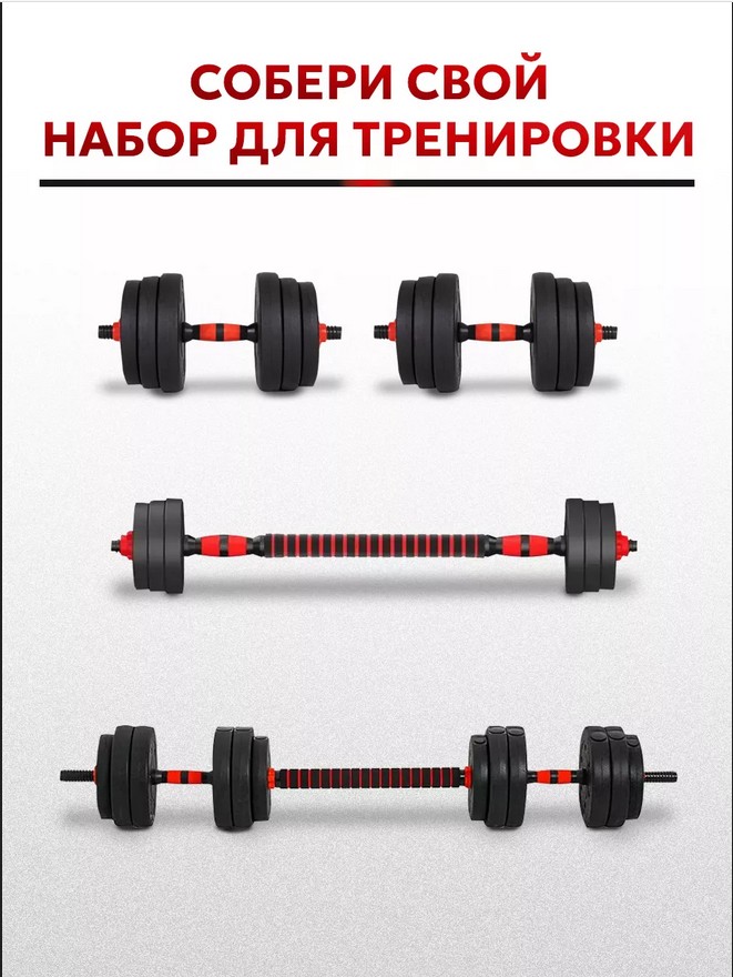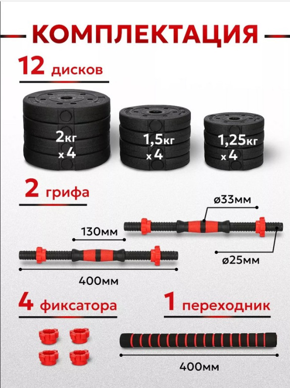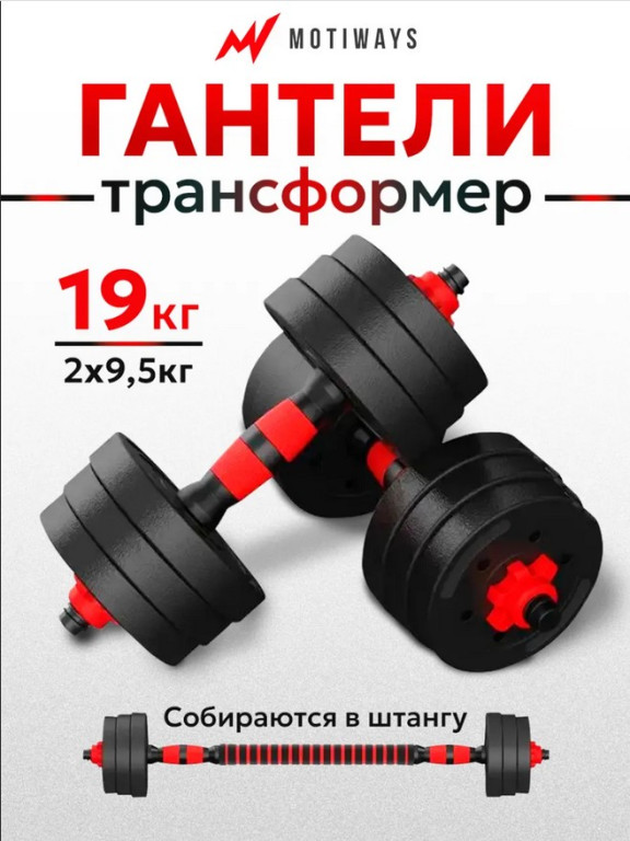 Разборные гантели Motiways 19 кг (2х9.5 кг), черно-красные. В набор входят блины 2 кг, 1.5 кг, 1.25 кг, грифы 40 см с неопреном, фиксаторы и переходник на штангу. Универсальный комплект для силовых тренировок дома и в зале.ХарактеристикиВес кг.