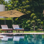 Она зависит от назначения изделия. Если вам нужно оборудовать летнюю площадку ресторана, стоит выбирать зонты от солнца и дождя, высотой не менее двух метров, чтобы гости могли свободно вставать и ходить между столиками. Если вы обустраиваете зону вокруг бассейна, то высота зонта может быть меньше.
