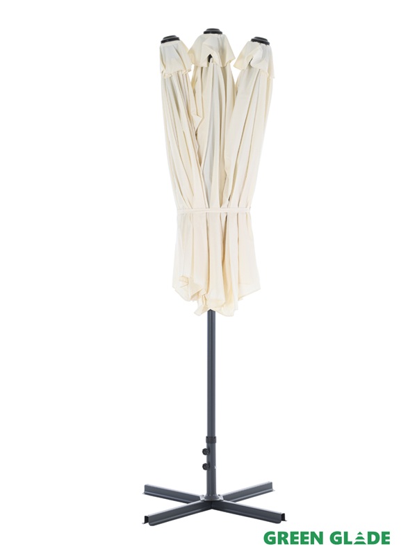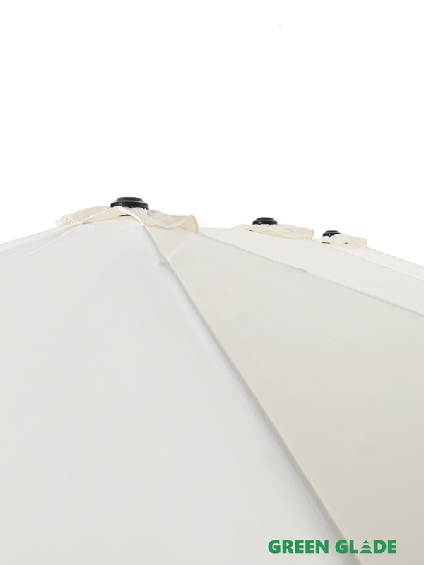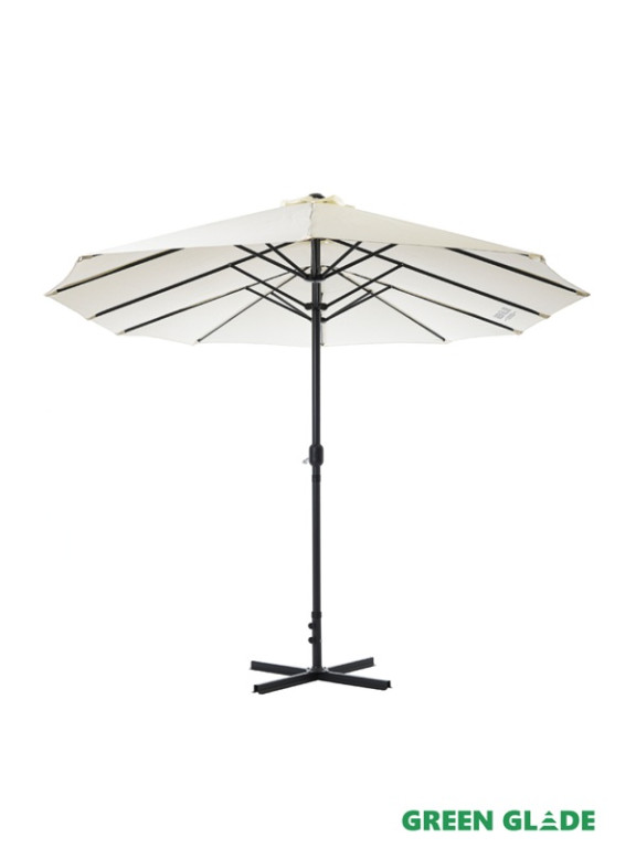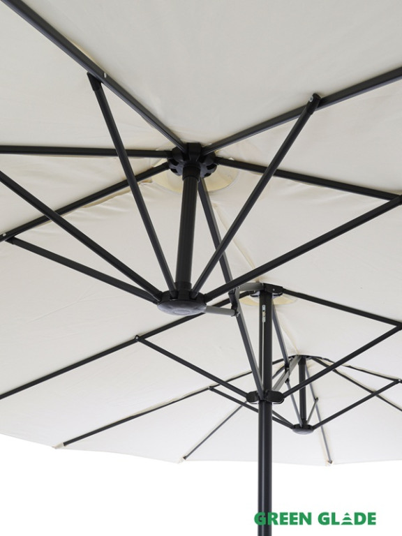 Большой зонт Green Glade с центральным расположением стойки предназначен для защиты от солнца на даче, загородном участке или у бассейна. Купол открывается с помощью лебедки. Вокруг стойки можно свободно разместить пластиковую мебель: шезлонги или обеденный стол.