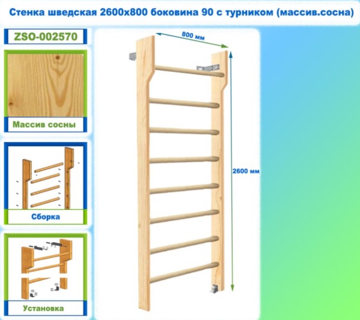 Стенка шведская деревянная с турником Dinamika ZSO-002570 с турником, 260х80 см (массив.сосна)