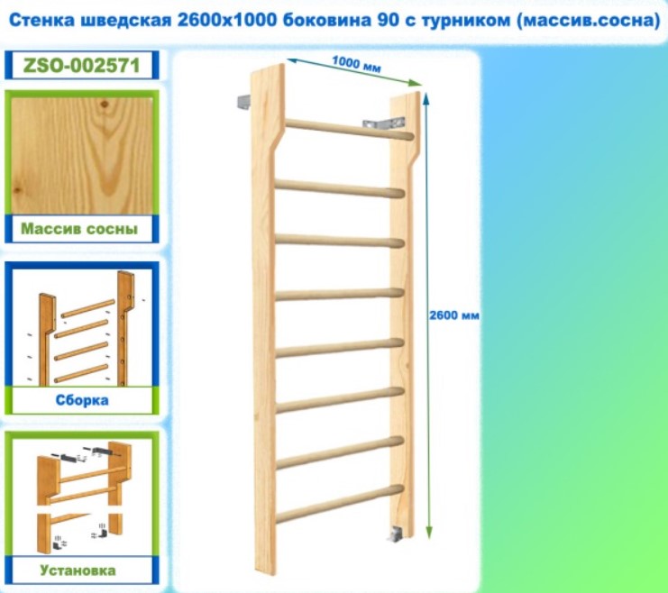 Стенка шведская деревянная с турником Dinamika ZSO-002571 с турником, 260х100 см (массив.сосна)