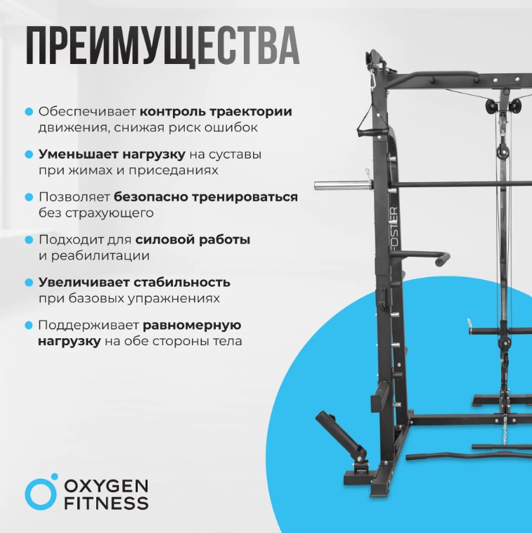 Силовое оборудование OXYGEN FITNESS FOSTER, представленное в виде машины Смита Смита, идеально подходит для желающих найти качественное тренажерное оборудование на свободных весах. Этот тренажер, разработанный с учетом современных стандартов фитнес-индустрии, дает возможность эффективно тренировать различные группы мышц, обеспечивая безопасность и надежность во время занятий. С весом 128 кг, машина имеет прочную структуру, обеспечивающую устойчивость во время выполнения упражнений. Гриф длиной 197 см и диаметром 50 мм обеспечивает комфорт и удобство во время тренировок. Тренажер оснащен 9 уровнями регулировки, что позволяет легко настроить его под индивидуальные потребности пользователя. Мощный партнер в достижении целей фитнеса — машина Смита OXYGEN FITNESS FOSTER. Она предлагает возможность выполнения разнообразных упражнений для развития различных мышечных групп. Устройство оснащено 2 стаканами для грифа и 4 пружинными замками, что обеспечивает быструю и безопасную смену весов, повышая эффективность тренировок. Стальной трос диаметром 5 мм обеспечивает надежную и долговечную систему нагрузки. Разнообразие мышечных групп можно тренировать с учетом возможностей полукоммерческого использования, подходящего как для небольших фитнес-залов, так и для домашних тренировок. Прочные стальные тросы и качественные материалы гарантируют надежность и высокое качество оборудования.*ХарактеристикиТипМашина Смита ВидПолупрофессиональный Страна БрендаГермания Длина грифа197 см Диаметр втулки диска51 мм Тип нагруженияСвободный вес Трос5 мм ДополнительноГриф - 197 см, ф50, 9 уровней регулировки по высоте, стакан для хранения грифа, 4 пружинных замка для грифа. Силовая рама. Машина Смита. Многопозиционный турник. Многопозиционные брусья. Двойная тяга. Гребная тяга. Шарнирный крепеж грифа. Диапазон регулировок9 уровней Габариты164х170x215 см. (ДхШхВ) Размер упаковки в см (Д*Ш*В)223х53x53 Вес изделия кг128 Вес в упаковке кг131 Гарантия1 год ПроизводительКитай ИмпортерООО "Централ Спорт" г. Минск 220012, ул.Чернышевского 8 каб. 23 -