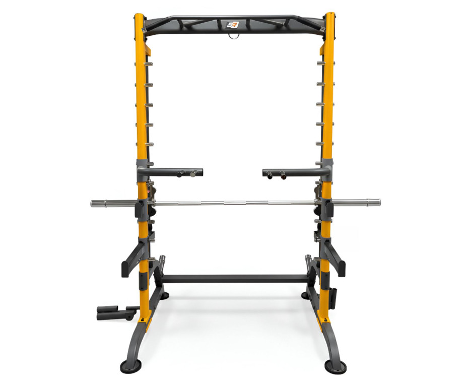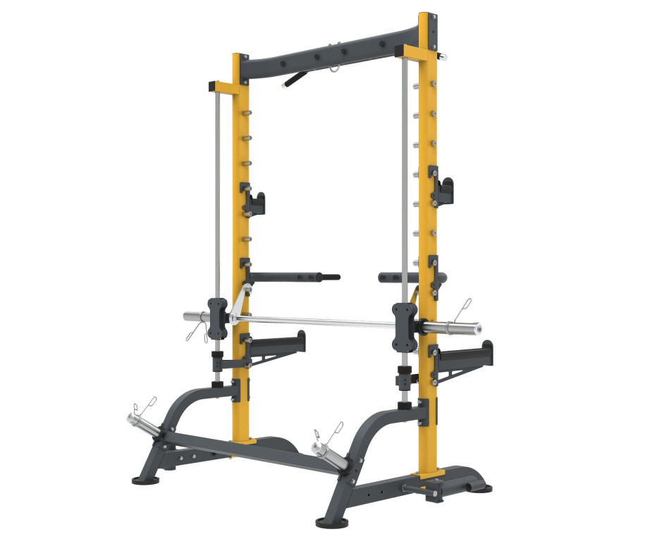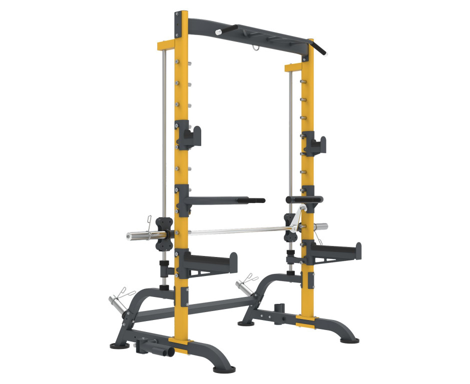 Тренажер выполнен в П-образной форме с усиленной рамой. Две вертикальные стойки служат направляющими для грифа, который перемещается строго по заданной траектории. По всей высоте стоек расположены отверстия для установки ограничительных кронштейнов — это позволяет настроить рабочую амплитуду под рост и тип упражнения.