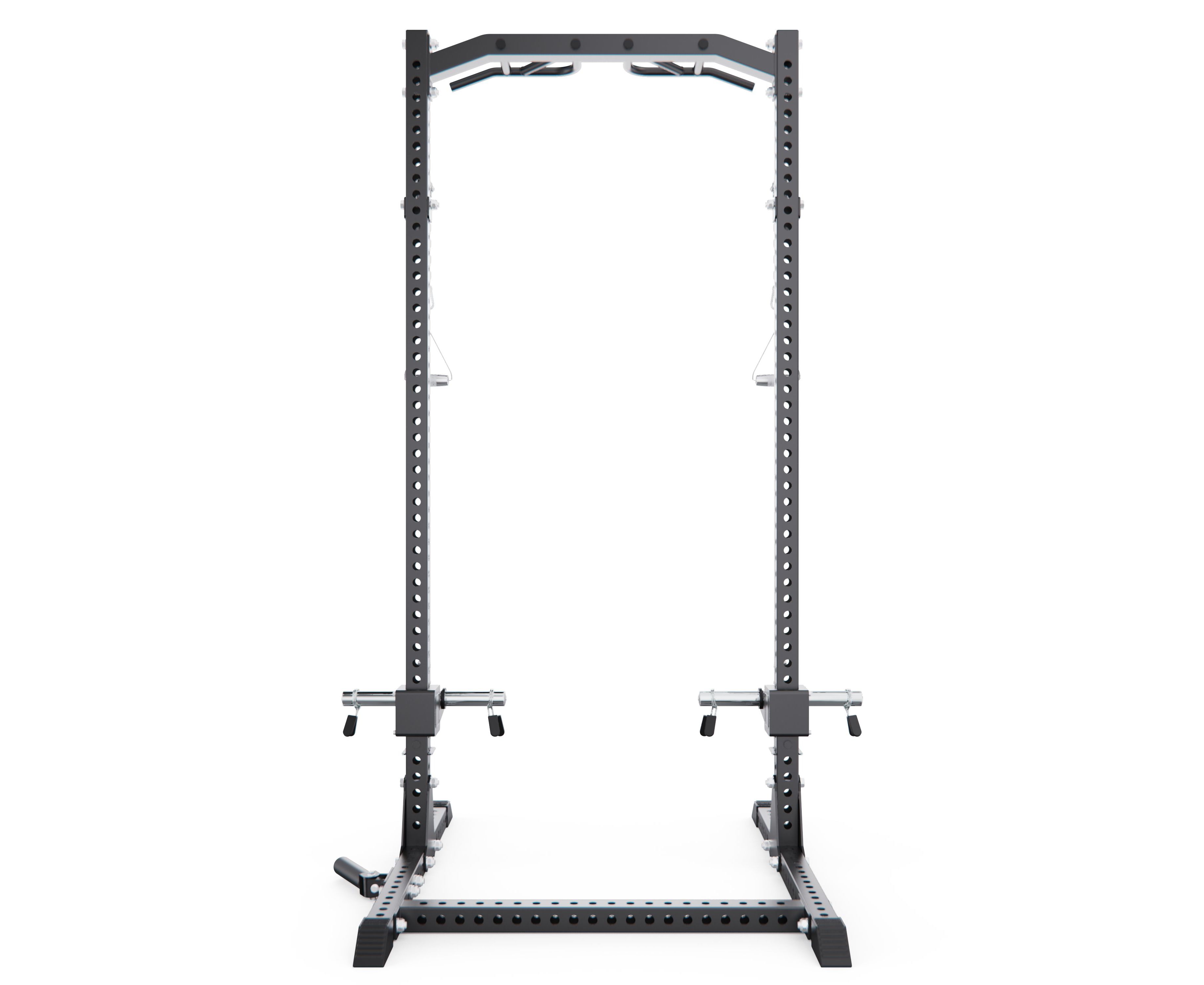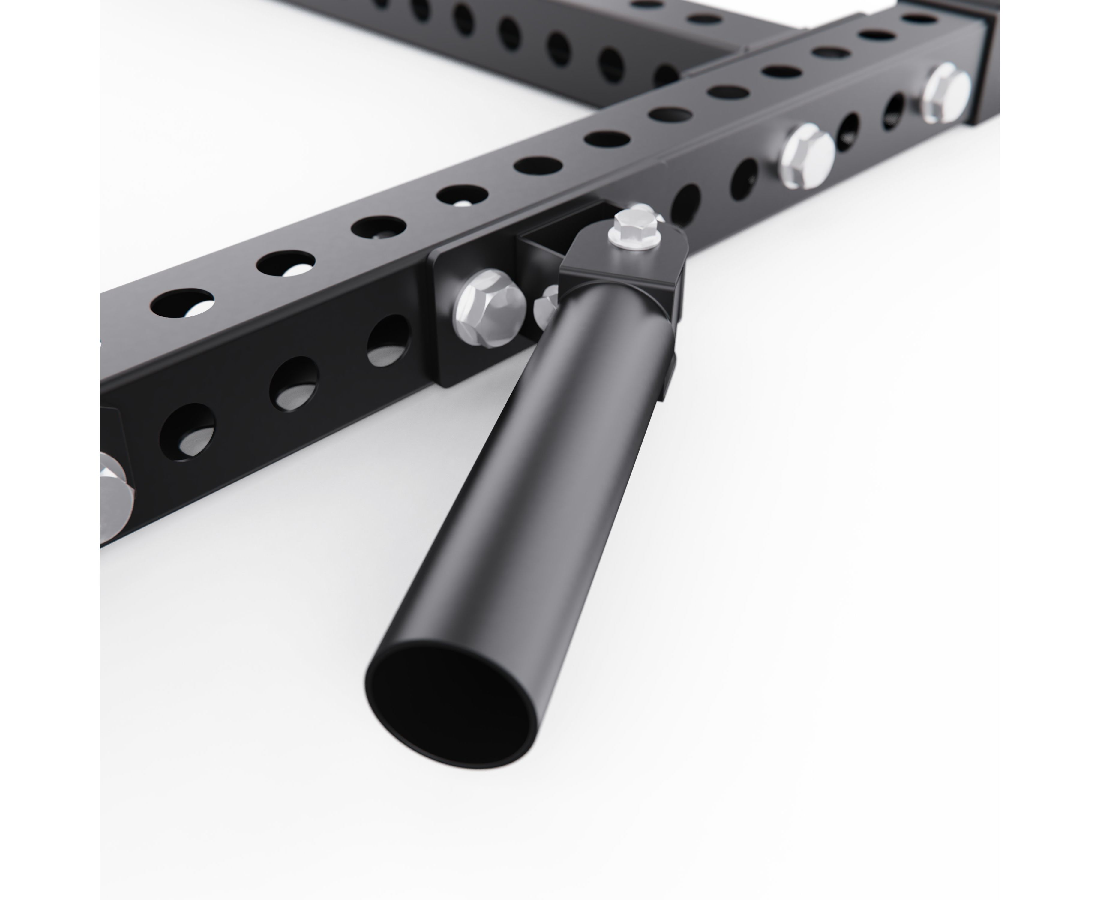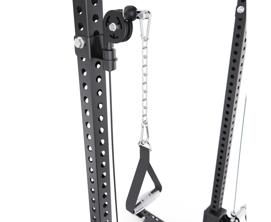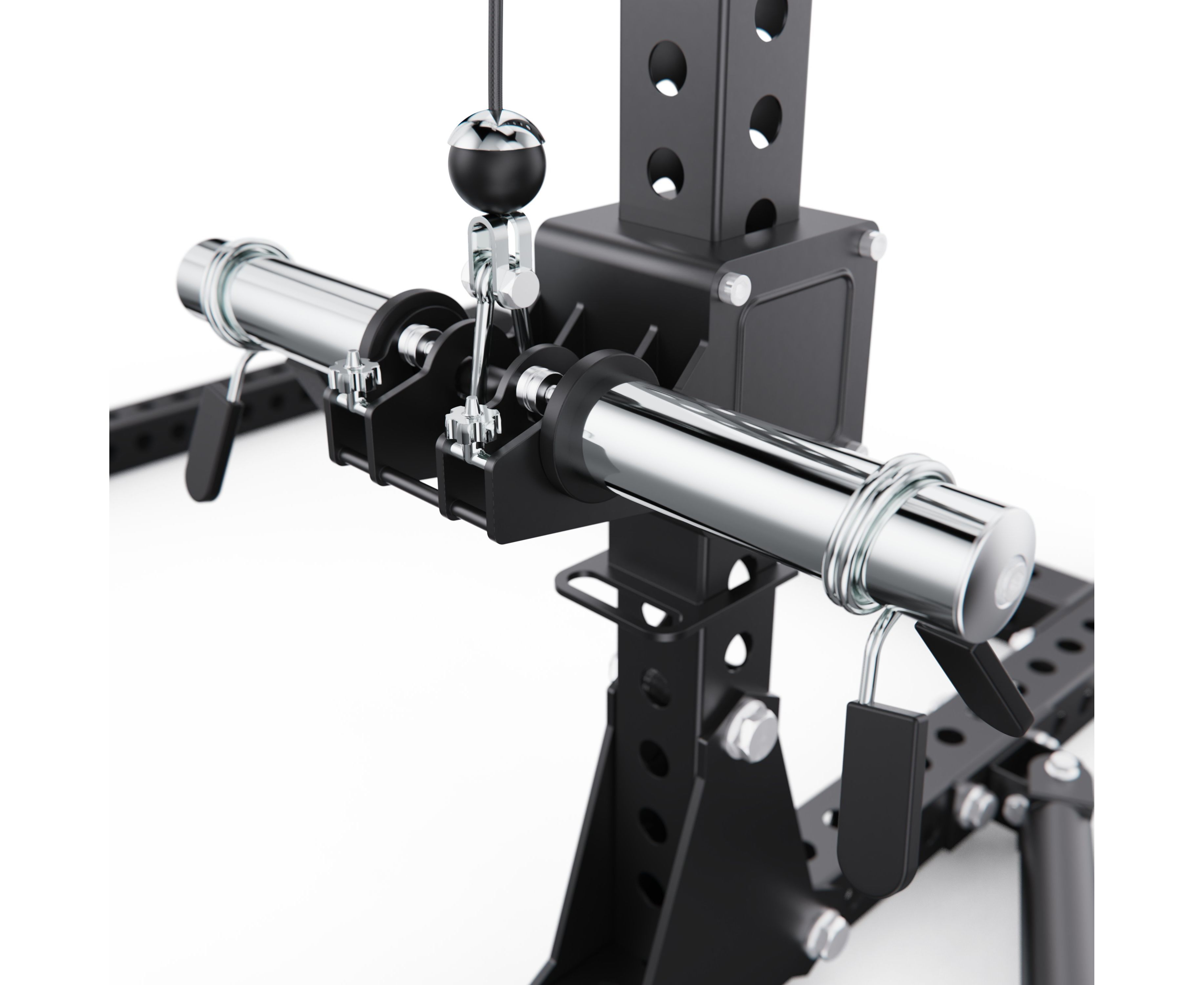 Тренажер представляет собой полноценный тренировочный центр. Четыре посадочных места с диаметрами 28 и 50 мм обеспечивают совместимость с различными типами блинов для упражнений в раме. Встроенный двусторонний кроссовер (верхний и нижний блоки) позволяет прорабатывать любые мышечные группы с плавной и регулируемой нагрузкой. Специальное отверстие для грифа выполняет функцию лэндмайна для жимов и тяг с естественной амплитудой. Дополняет возможности многопозиционный турник для подтягиваний разным хватом и тренировки мышц спины.