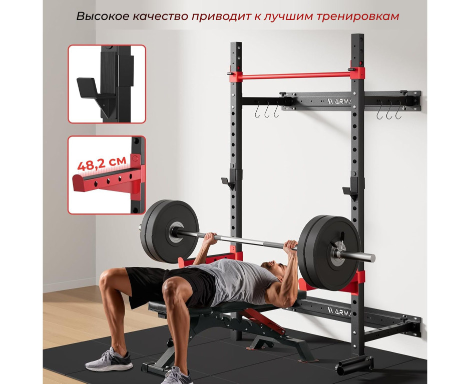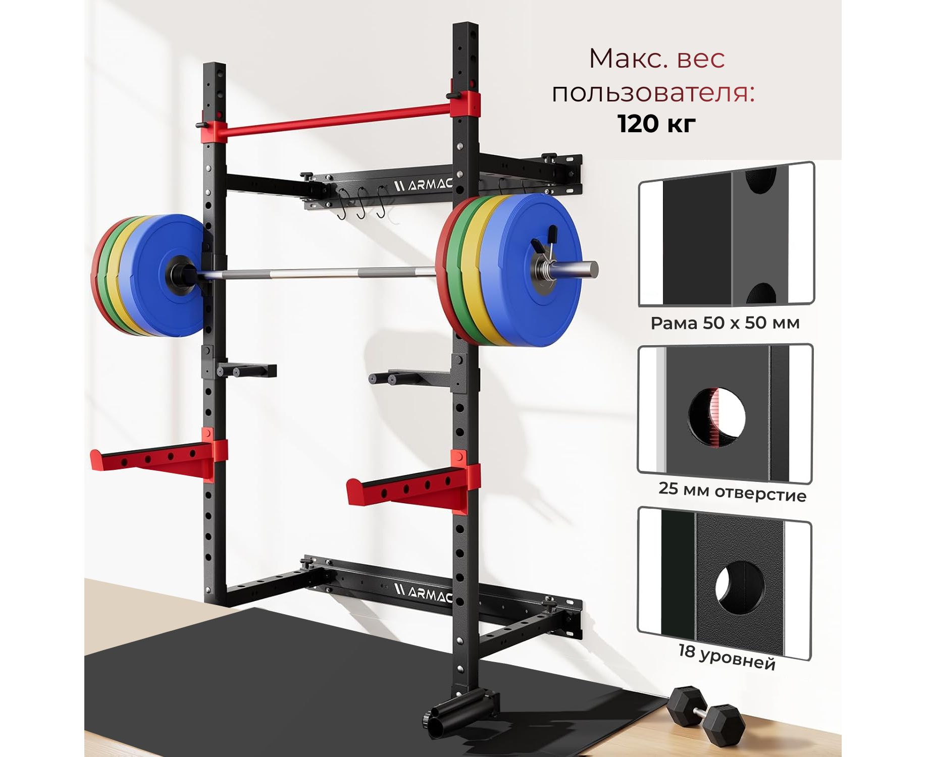 Конструкция рассчитана на статическую нагрузку до 410 кг и максимальный вес пользователя 120 кг, что обеспечивает безопасность для спортсменов разного уровня подготовки. Ключевой особенностью являются 18 регулировочных отверстий, позволяющих адаптировать высоту перекладин и упоров под рост пользователя и различные упражнения. Прочная конструкция гарантирует устойчивость и долговечность даже при регулярных интенсивных нагрузках.