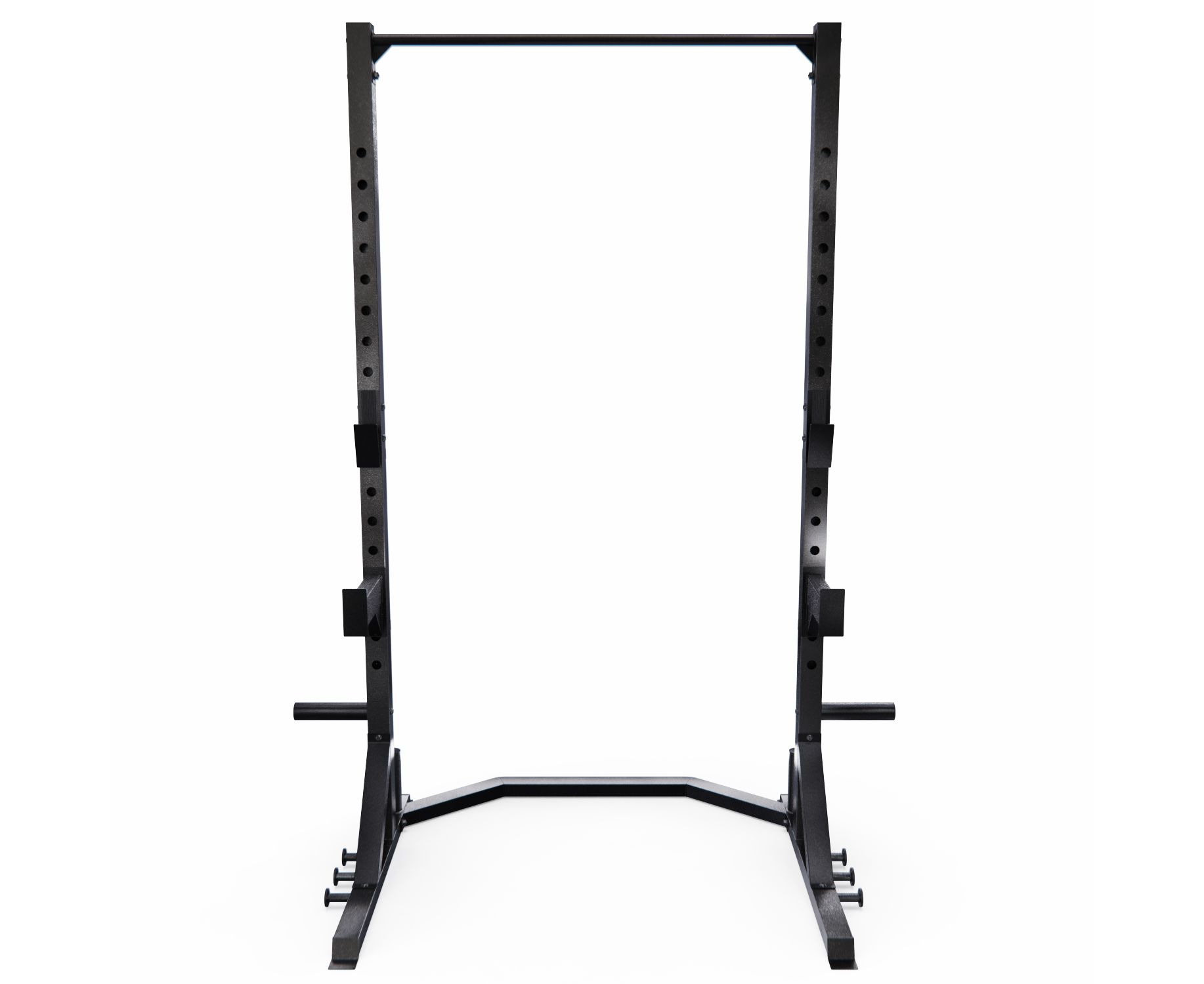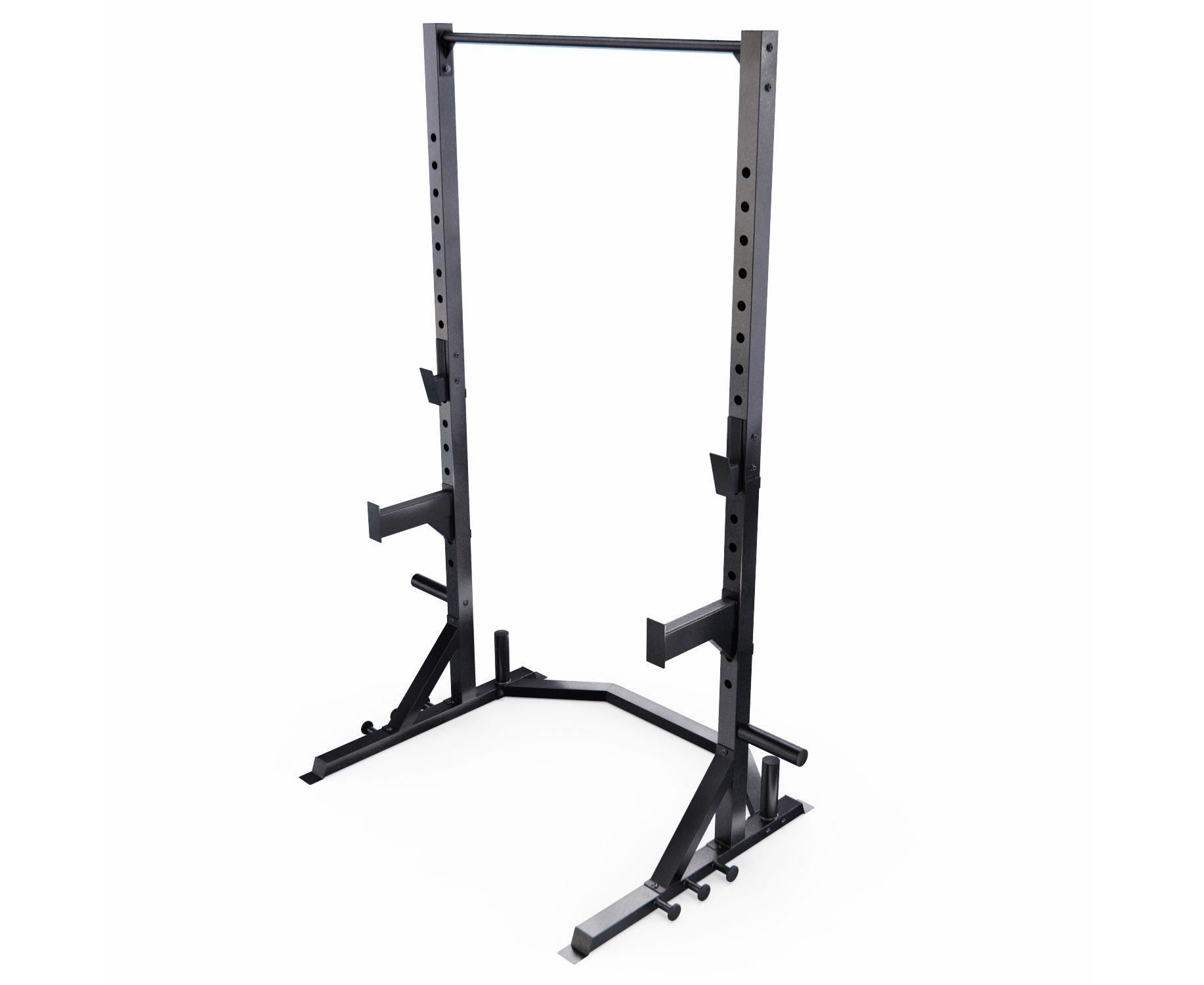 Конструкция изготовлена из прочной стали (профиль 75×75×2 мм) с порошковым покрытием для долговечности. Её высота составляет 216 см. Держатели для штанги и страховочные упоры регулируются по высоте на 18 уровней, что позволяет точно настроить оборудование под рост пользователя.