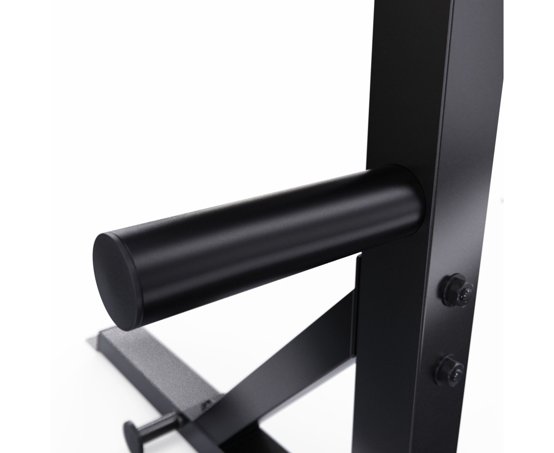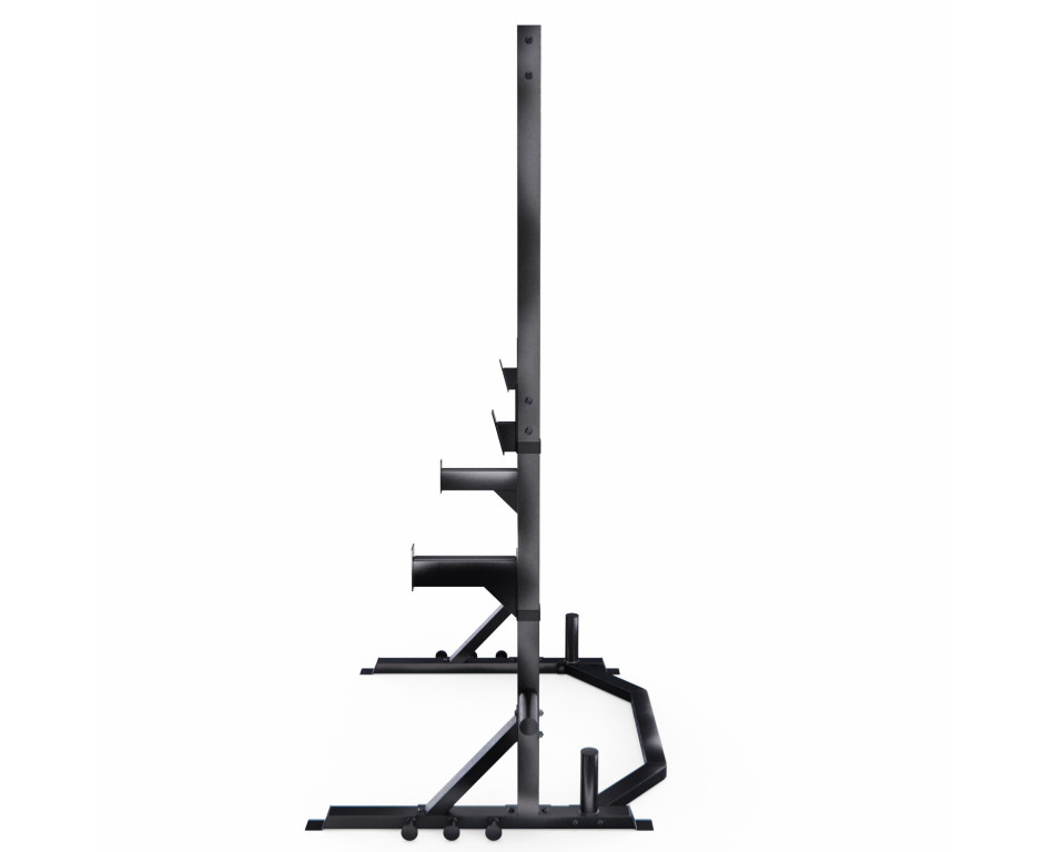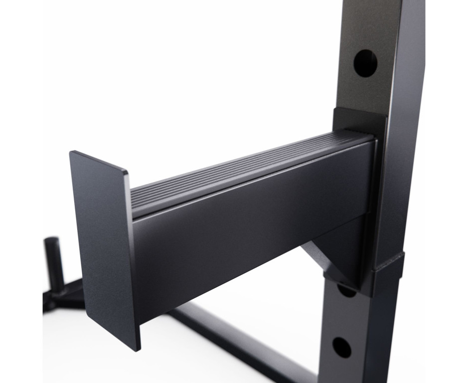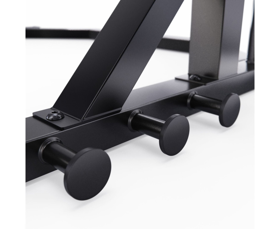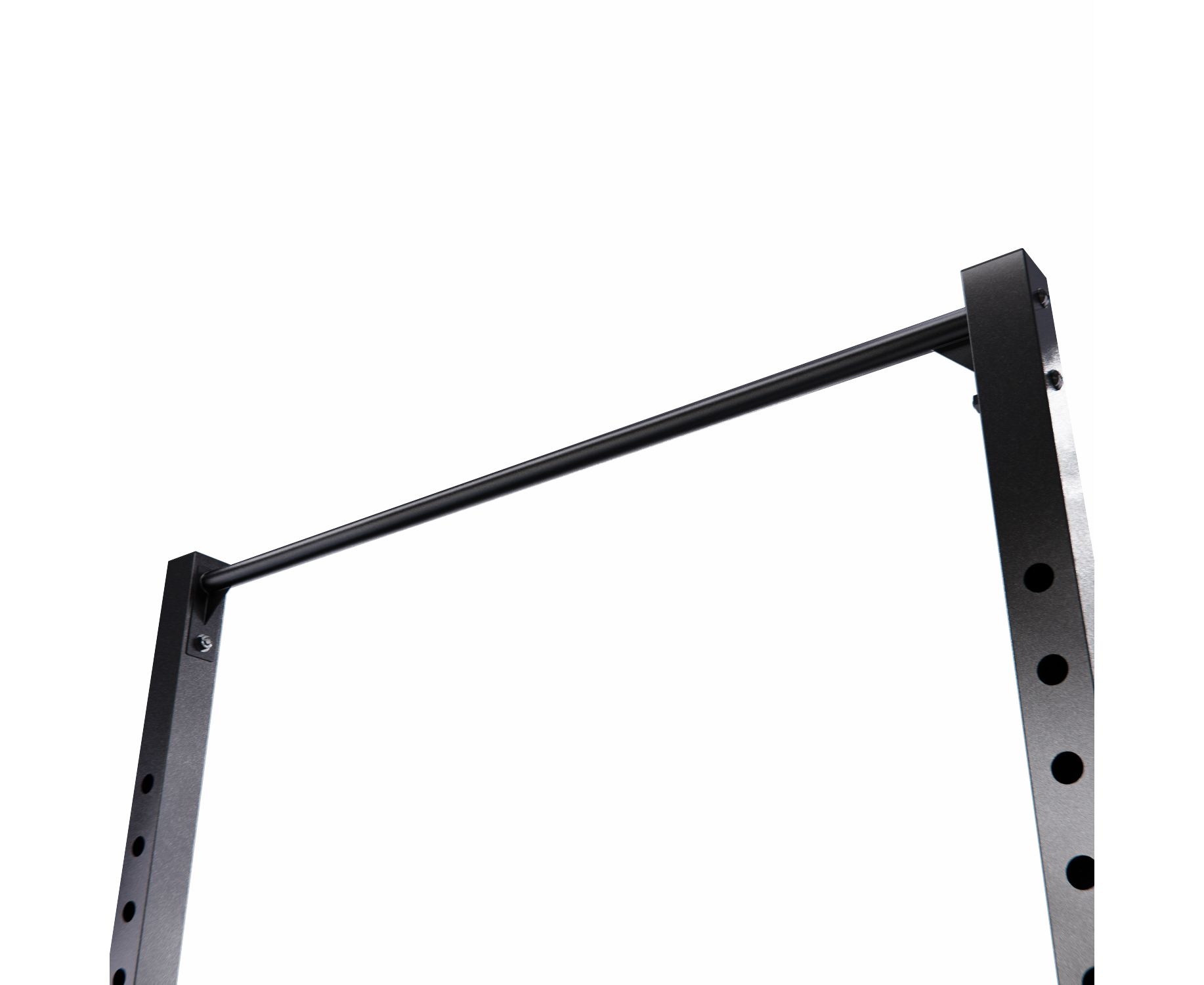 Стойка оснащена турником шириной 105 см для подтягиваний, который также можно использовать как крепление для эспандеров или другого инвентаря. Для хранения весов предусмотрены 2 посадочные втулки для дисков (диаметр 50 мм) и 2 втулки для грифов (диаметр 60 мм).