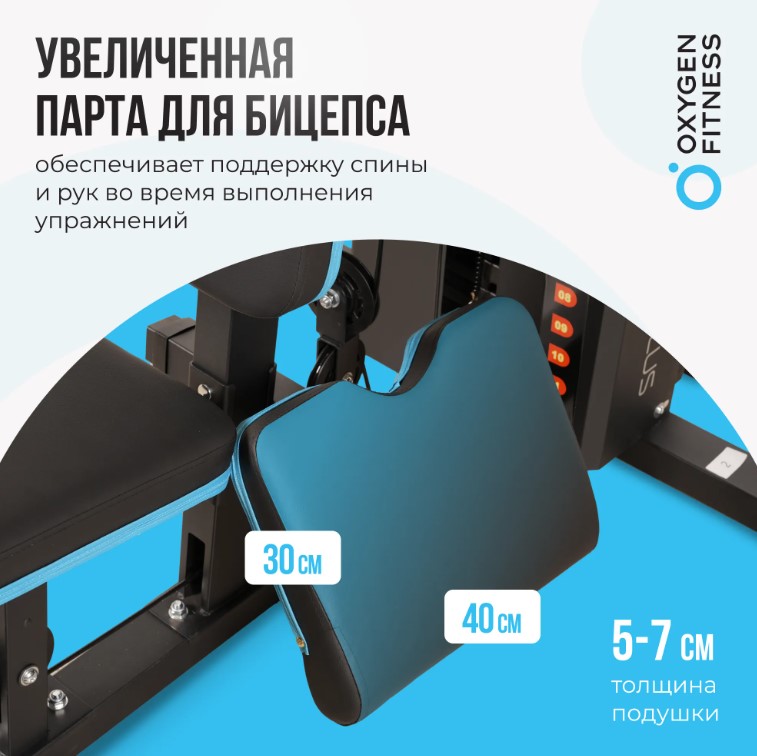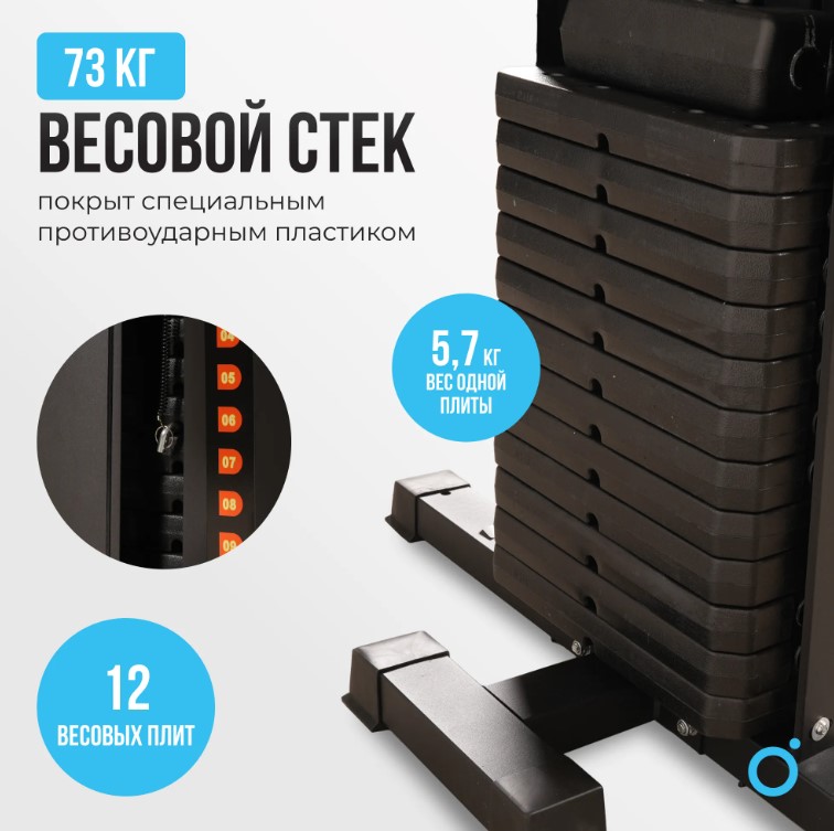Многофункциональная мультистанция OXYGEN FITNESS NOLAN PLUS предлагает широкий выбор упражнений для тренировки различных мышечных групп. Стойкая стальная конструкция и максимальная весовая нагрузка до 73 кг обеспечивают долговечность и надежность в использовании. Удобное эргономичное сиденье с наполнителем из PU поролона и обивкой из искусственной кожи обеспечивает комфорт во время длительных тренировок. Комплекс оснащен 12 плитами стека весом 5, что позволяет выполнять разнообразные упражнения для всех групп мышц. С множеством удобных аксессуаров в комплекте, таких как канат для трицепса, рукоятка для тяги сверху, манжета для ноги, прямая рукоятка и платформа для жима ногами, тренажер OXYGEN FITNESS NOLAN PLUS обладает регулируемым сиденьем с 4 уровнями высоты для настройки под рост пользователя. Его прочная стальная конструкция с системой тросов диаметром 6 мм обеспечивает безопасность и эффективность тренировок. Каждая гиря весит 7 кг, что дает возможность легко регулировать уровень нагрузки, делая тренажер подходящим для людей разного телосложения. Силовой комплекс OXYGEN FITNESS NOLAN PLUS - отличное решение, как для занятий дома, так и для посещения фитнес-клубов компаний, обеспечивая удобство и результативность тренировок. В комплекте имеются 4 неопреновых валика для ног и 2 для рук, что обеспечивает безопасность и комфорт во время упражнений. Размеры подушек (спинка, сиденье, парта для бицепса) разработаны с учетом анатомических особенностей, обеспечивая правильную поддержку тела. Прочная стальная конструкция и качественные материалы гарантируют долгий срок службы, а также обеспечивают возможность тренировки всех групп мышц с помощью одного тренажера. Эргономичное сиденье и продуманные размеры подушек создают максимальное удобство для пользователя, что делает тренировки еще более комфортными.*ХарактеристикиТипСиловой тренажер ВидПолупрофессиональный Страна БрендаГермания ?Скамья скоттаОпция позволяет выполнять упражнения на битепс сидяЕсть ?Ножной блокОпция позволяет выполнять упражнения на ноги, сидяЕсть ?БаттерфляйОпция позволяет выполнять упражнения на грудные мышцы лежа, сводя и разводя рукиЕсть Вес пользователя кг.150 Тип нагруженияГрузоблочный Регулировка сиденья по вертикалиЕсть Трос6 мм ДополнительноПодвесной мешок: обивка экокожа, вес - 18-20 кг. Брусья, турник, поднятие ног, кольца для груши. Размеры подушек: спинка - 22.5*39*6, подлокотники - 34.5*15*6, скамья для пресса: спинка - 42*32*6, сиденье - 121*31.5*6, жим ногами: изголовье - 24*23*6, спинка - 50*30*6, сиденье - 39.5*35*6, неопреновые валики Ф85 - 4 пары, неопреновые валики под локти - Ф95 Комплектацияканат для трицепса, рукоятка для тяги сверху, манжета для ноги, прямая рукоятка, парта бицепса, неопреновые валики - 4 для ног (ф 8.5), 2 для рук (ф 9). Размеры подушек: парта бицепса – 30*40*5 (7) см, подголовник – 24*24*5 см, спинка – 30*50*5.5 см, сиденье – 39*35*5.5 см, 4 уровня регулировки по высоте. Жим ногами: регулировка - 5 ур.по высоте, 5 – по длине, место для ног – 35*45 см. ?Вес стеков, кгГрузы73 Профиль50х70мм Тип стековвесовые плиты, 12 штук по 5.7 кг ?НаправляющиеНадежнее покрытие хромированное. Порошковая краска со временем слазитХромированные Кол-во стеков1 Размер парты скотта40х30х5.5 см Защита стекаЕсть, стальной Габариты198х94x212 см. (ДхШхВ) Материал сиденьяэргономичное с наполнителем из PU поролона и обивкой из искусственной кожи 