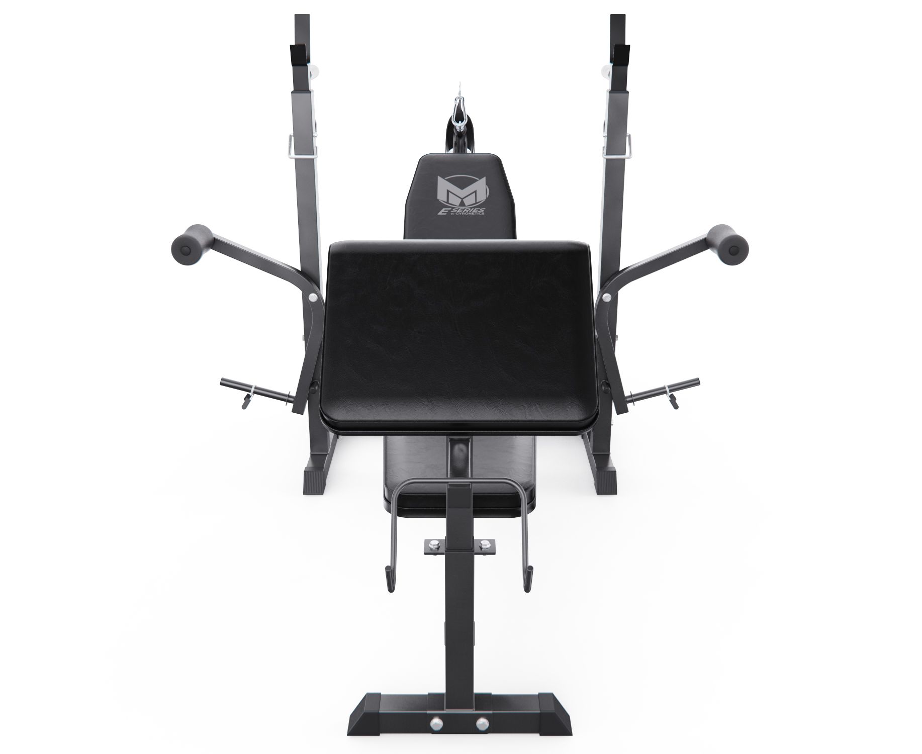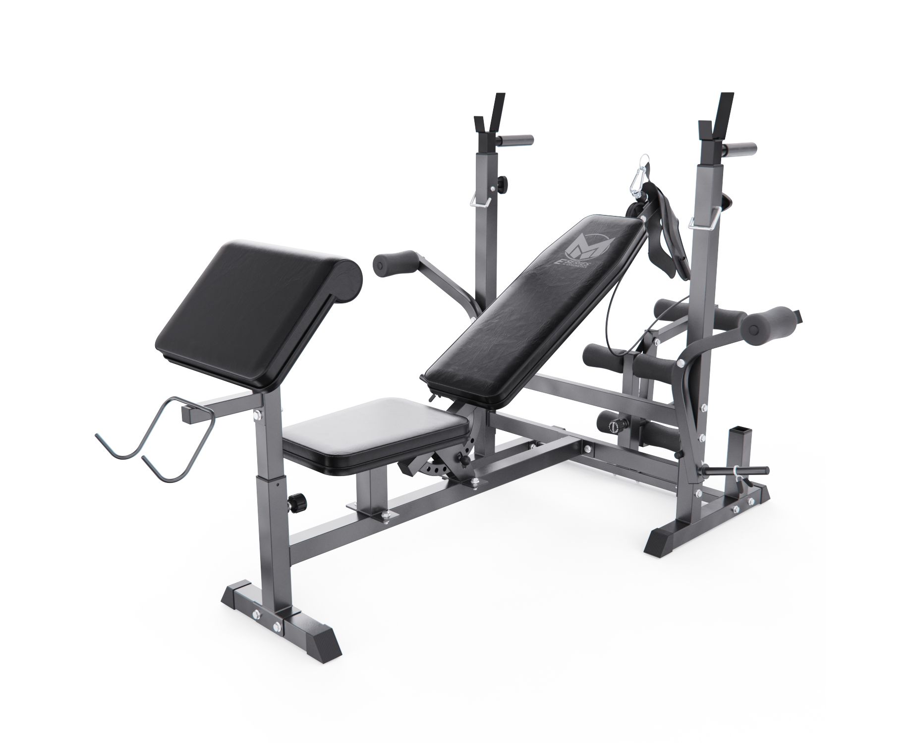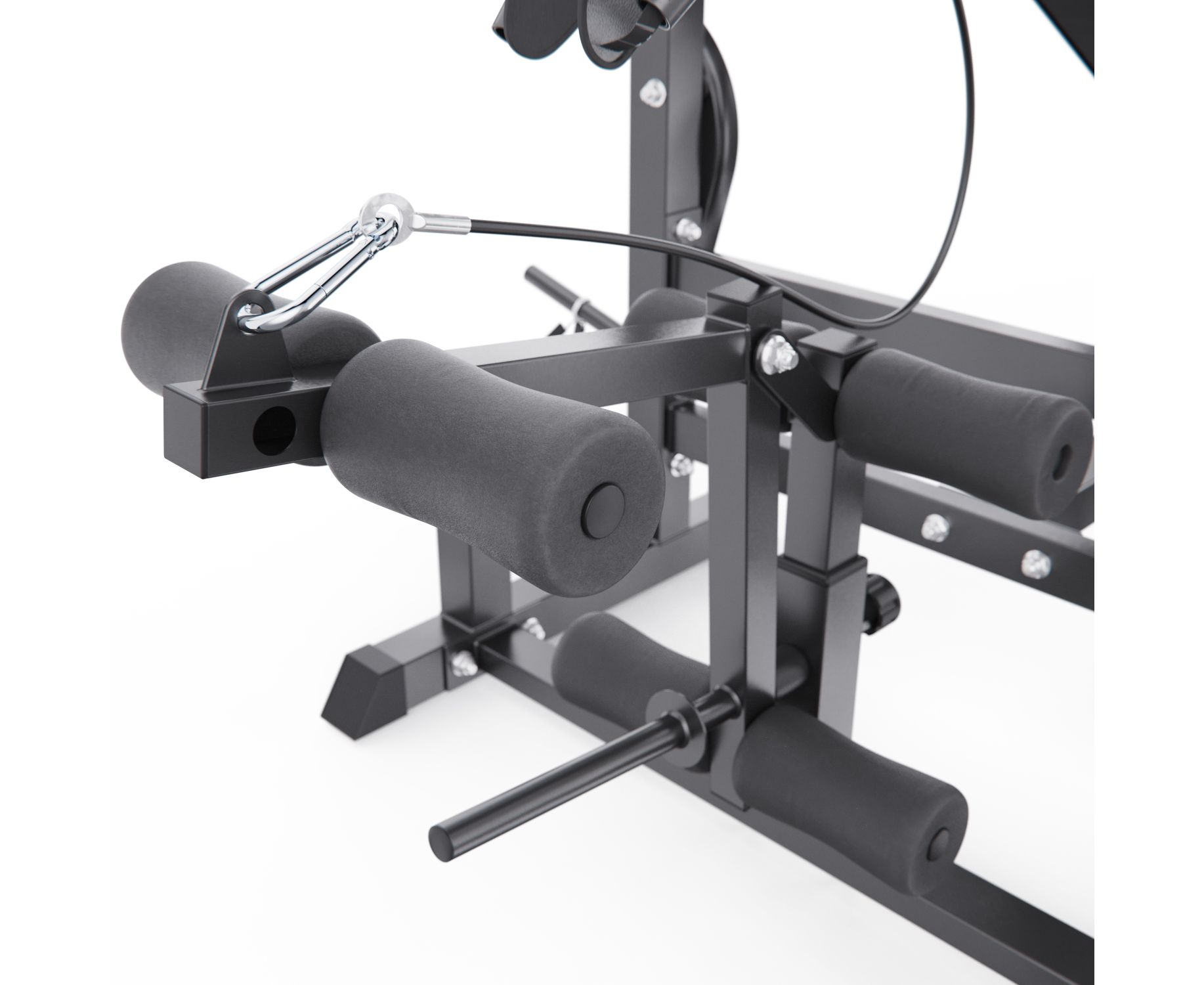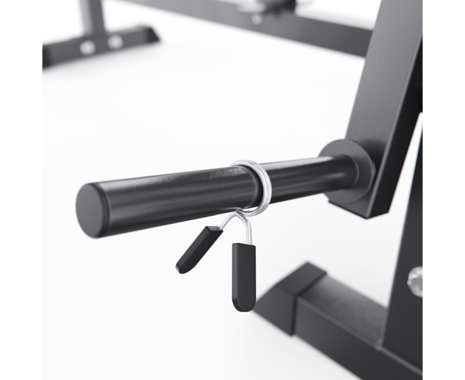 Тренажёр включает ручные рычаги-бабочки для грудных мышц, кабель для жима на трицепс и поручни для отжиманий на брусьях, значительно расширяя его функциональность. Посадочный диаметр для дисков — 25 мм, в комплект входят 2 пружинных фиксатора.