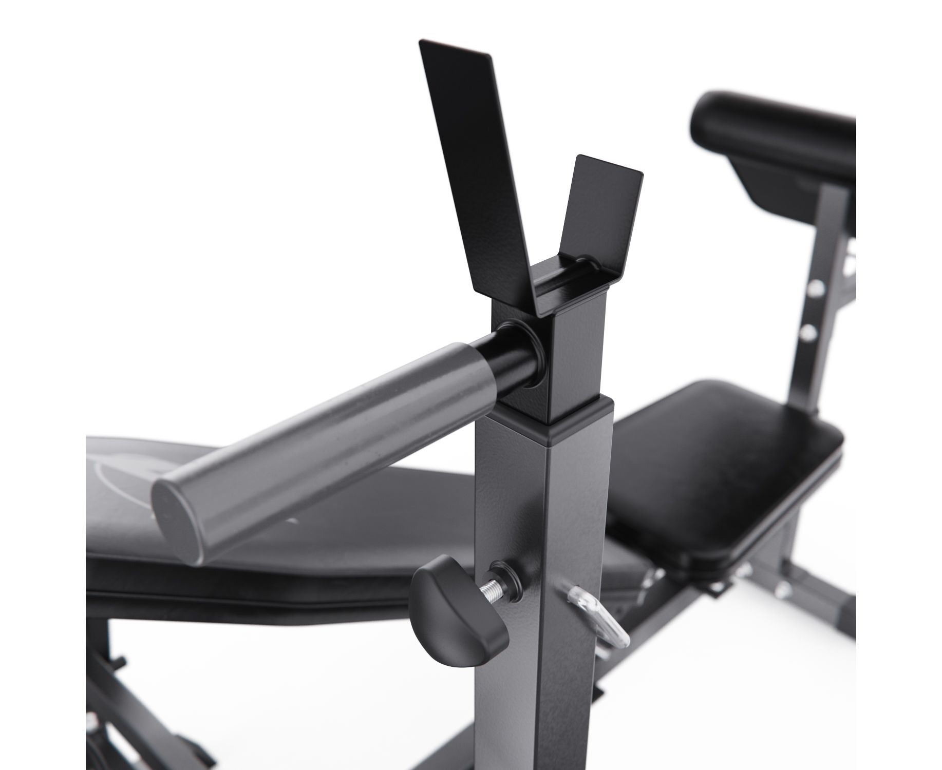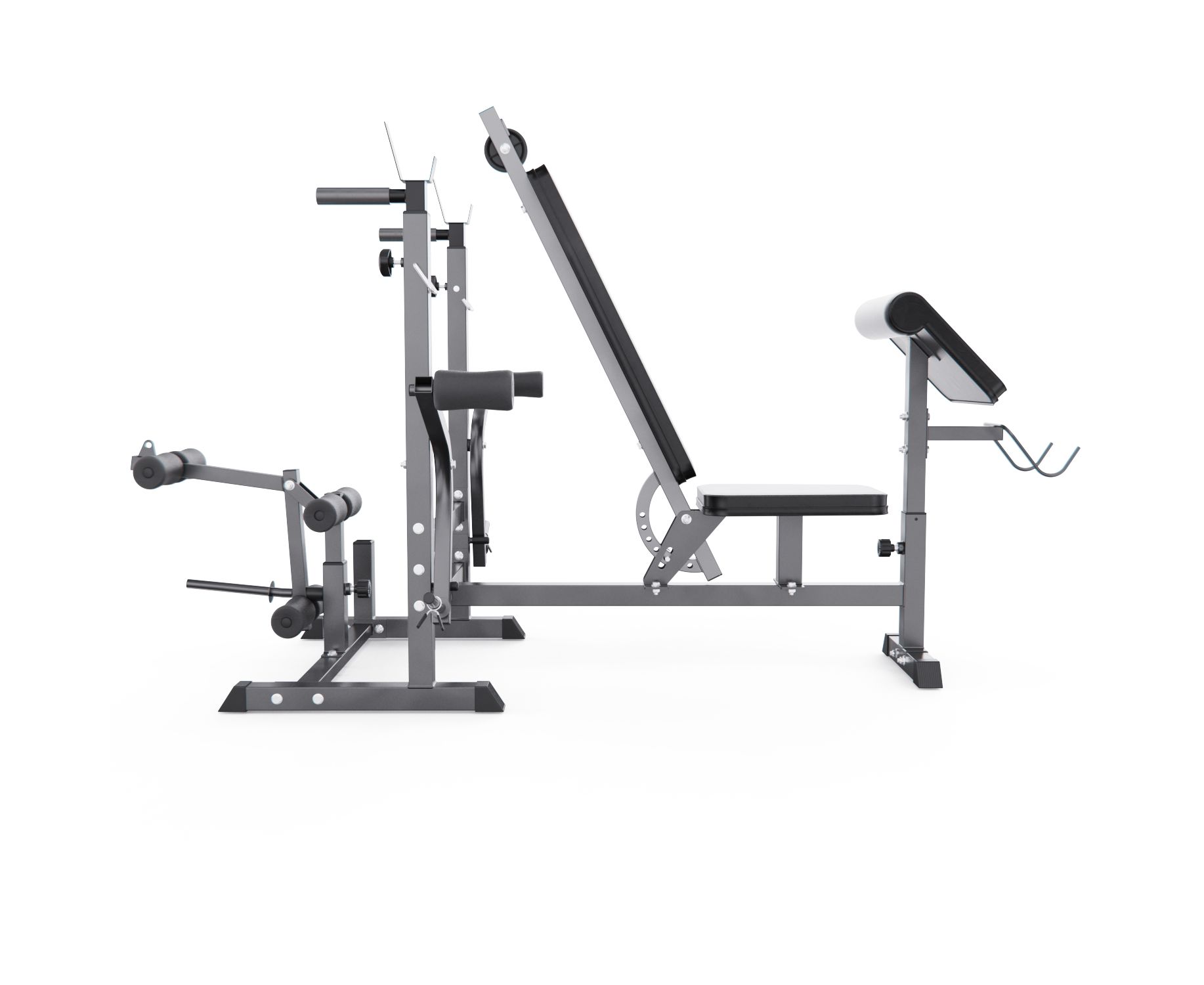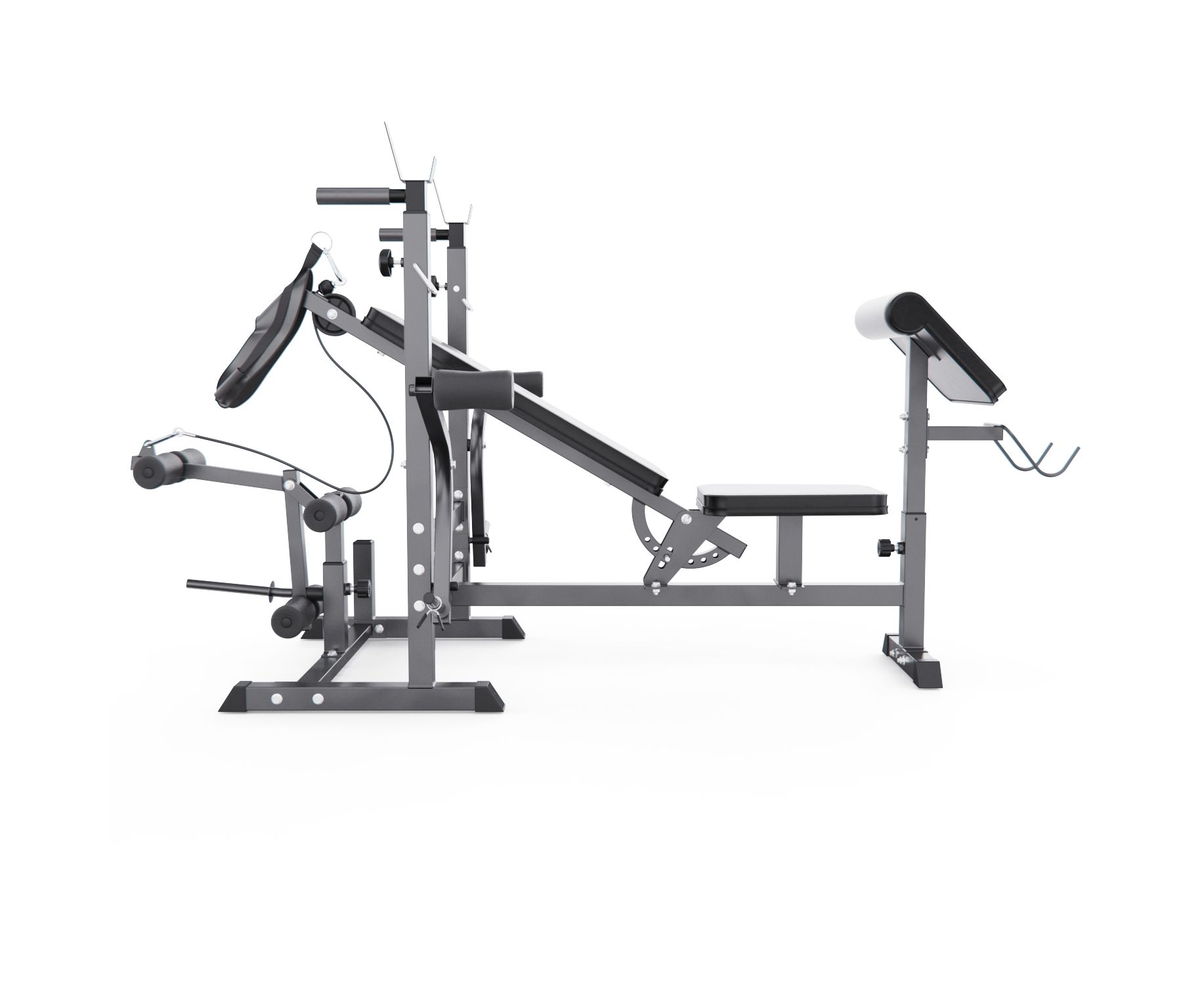 Тренажёр включает ручные рычаги-бабочки для грудных мышц, кабель для жима на трицепс и поручни для отжиманий на брусьях, значительно расширяя его функциональность. Посадочный диаметр для дисков — 25 мм, в комплект входят 2 пружинных фиксатора.
