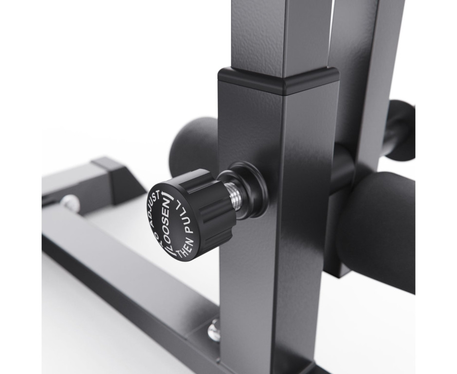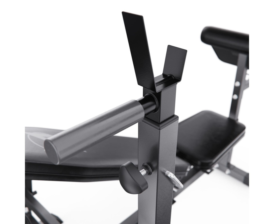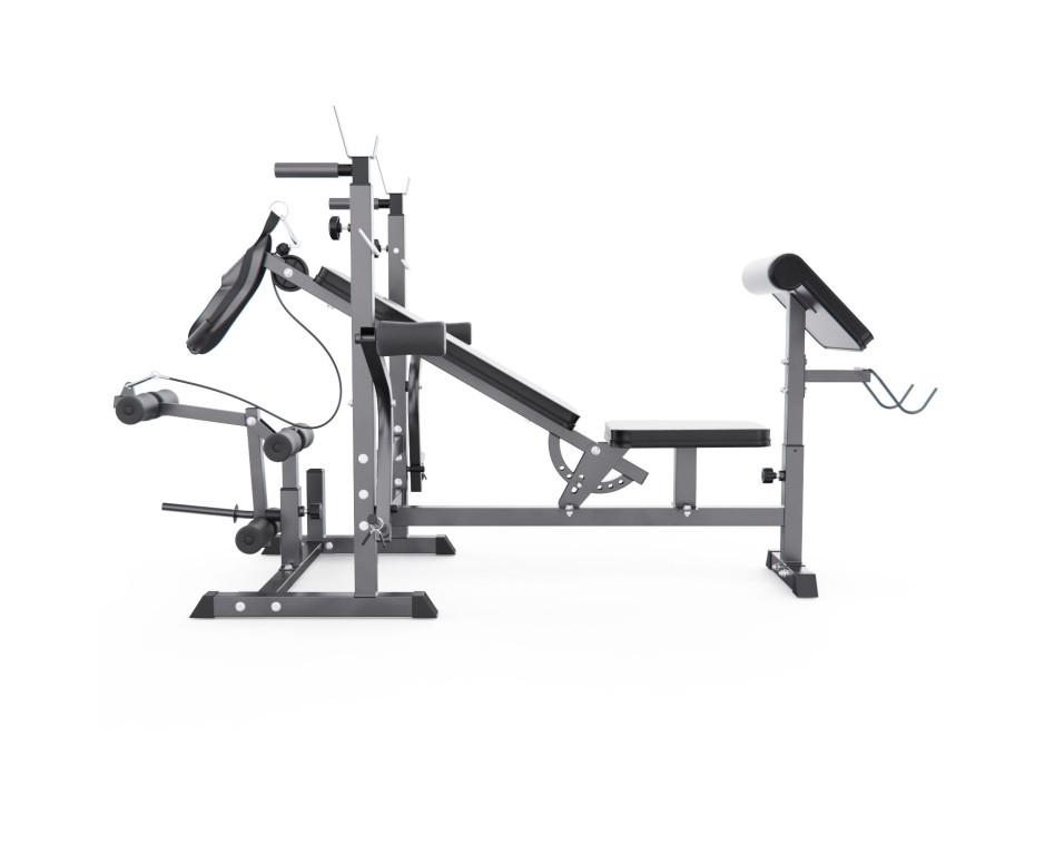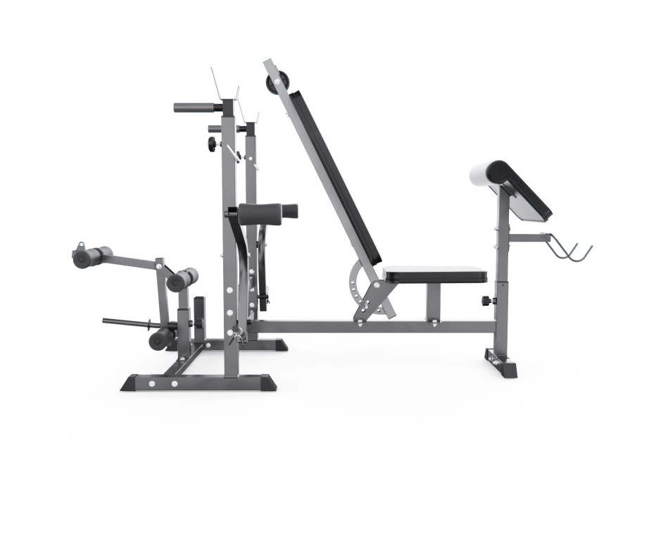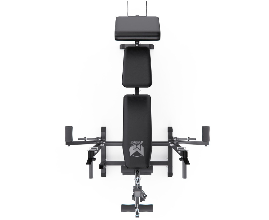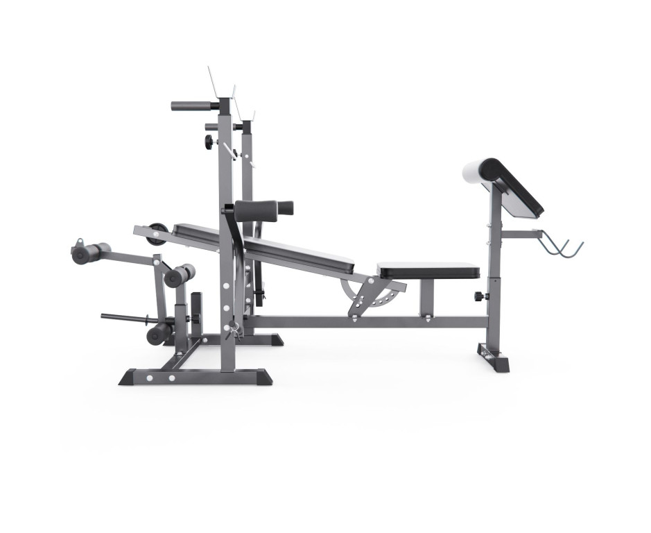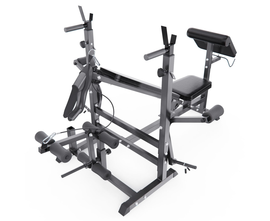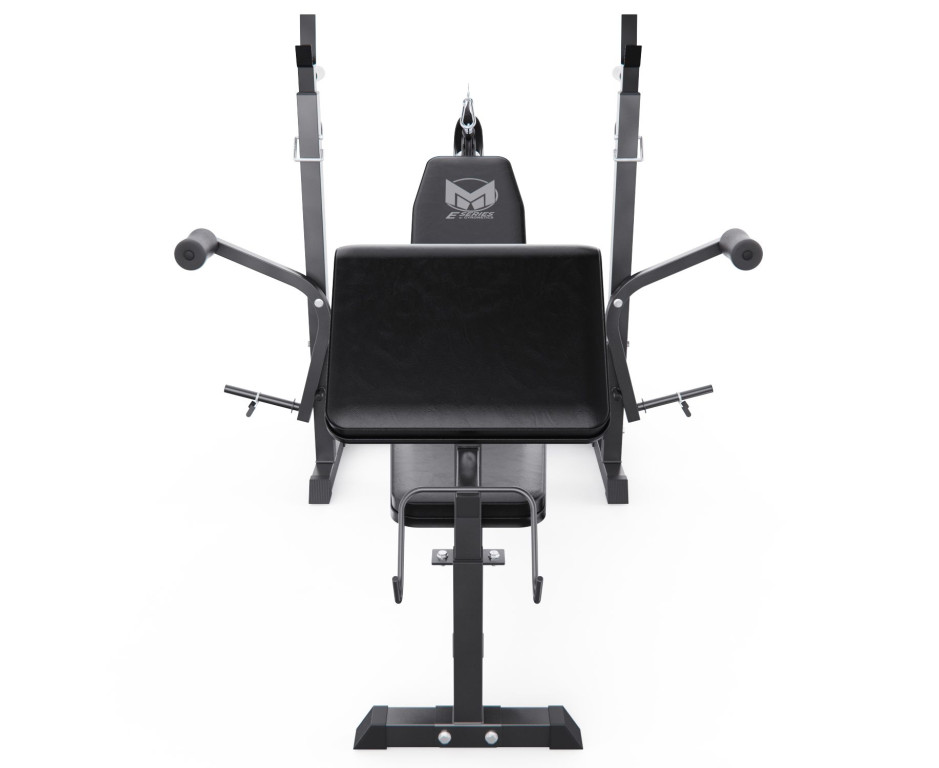 Конструкция оснащена 7-позиционной регулируемой спинкой (от 0° до 90°), позволяющей выполнять широкий спектр упражнений: горизонтальный и наклонный жим, жим сидя и другие. Скамья рассчитана на высокие нагрузки: общая максимальная нагрузка составляет 280 кг (включая 180 кг на сиденье, 60 кг на валики и до 40 кг на каждый рычаг «бабочка»). Стальная рама и нескользящие ножки обеспечивают устойчивость при интенсивной работе с весом.