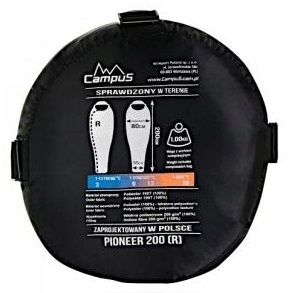 Campus PIONEER 200 - спальный мешок-кокон с капюшоном, однослойный, двухзамковая молния с внутренней планкой может соединить мешки с молнией L и R друг с другом. Капюшон затягивается и регулируется, рекомендован для использования при температуре до +3 градусов. Ткань верха хорошо пропускает воздух.ХарактеристикиТип