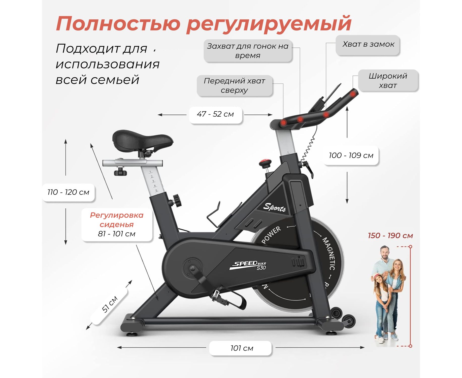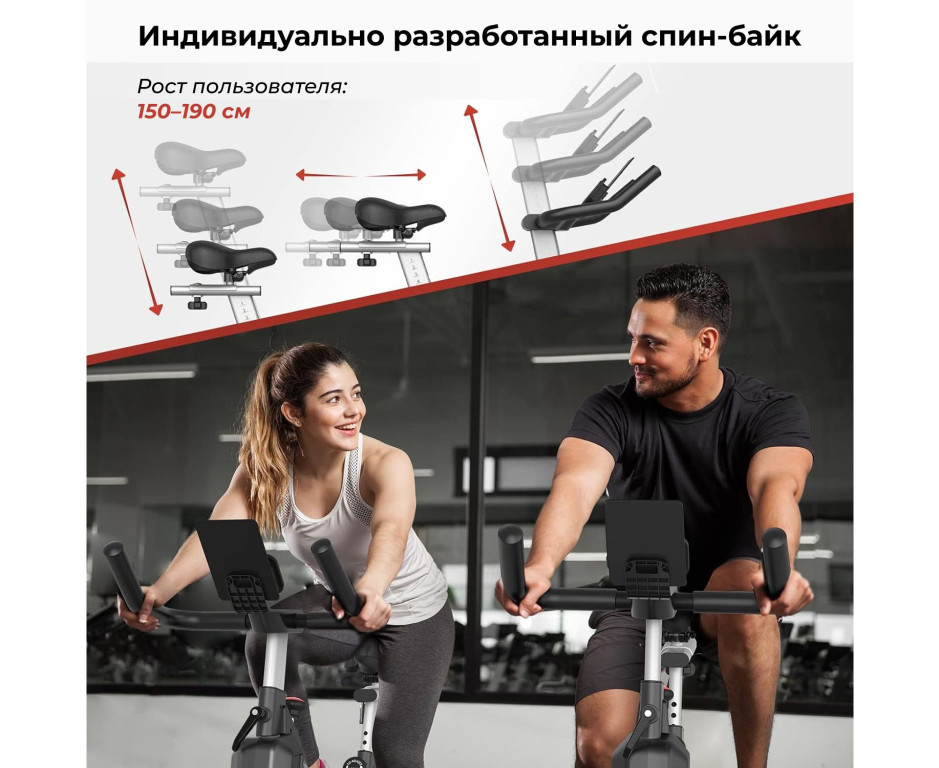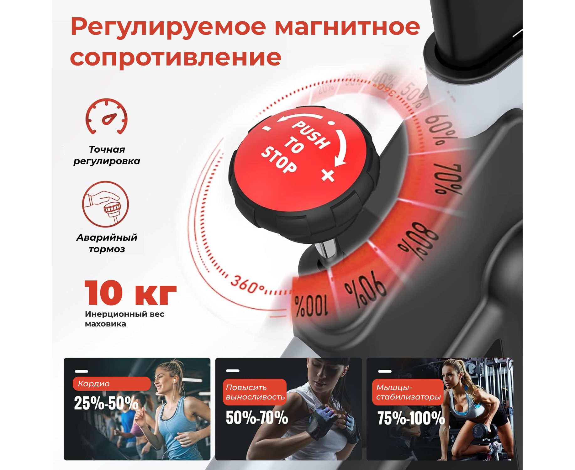 Тренажер оснащен магнитной системой нагрузки с механической бесступенчатой регулировкой сопротивления. Маховик инерционного веса 10 кг обеспечивает плавный и реалистичный ход. Сиденье регулируется по высоте (12 уровней, от 80.5 до 100.5 см) и горизонтали, что позволяет точно настроить комфортную посадку.Оснащение и функциональность