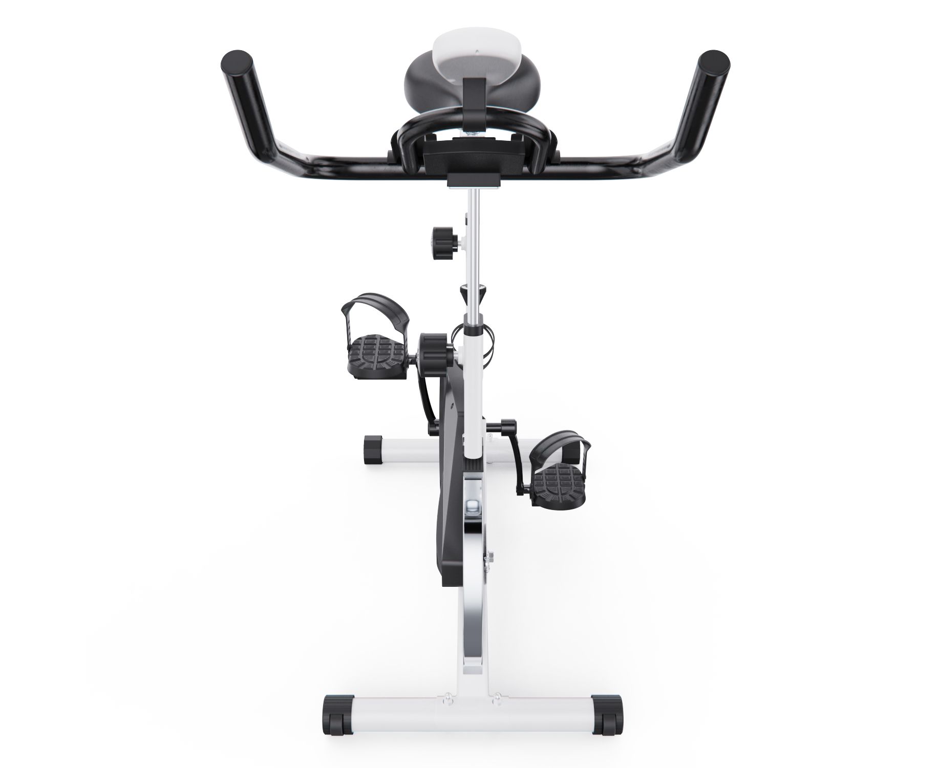 Конструкция включает прочную стальную раму, антискользящие ножки с компенсаторами неровности пола для устойчивости, транспортировочные ролики для удобного перемещения, а также держатель для бутылки и подставку под планшет. Компактные габариты (103×46×103–113,5 см) позволяют разместить тренажер даже в ограниченном пространстве.