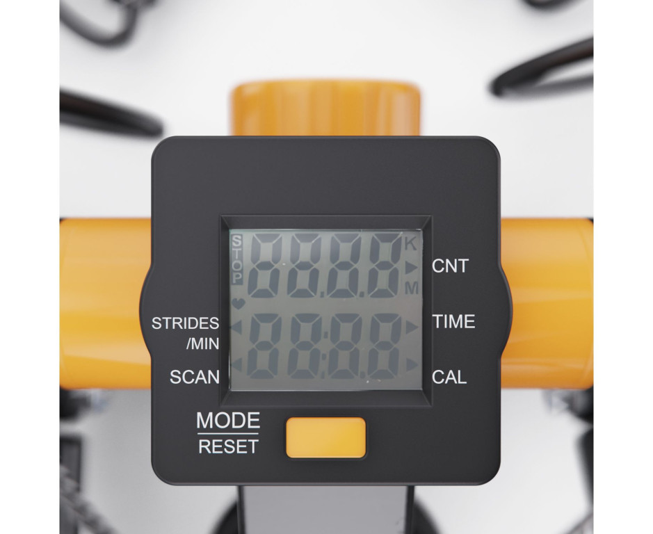 LCD-дисплей показывает время, количество шагов, темп и сожжённые калории. Питание от батарейки LR44 в комплекте.