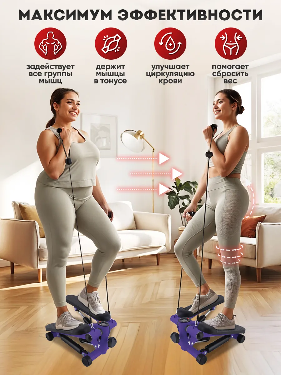 Мини-степпер с эспандерами поможет вам укрепить мышцы ног, ягодиц и рук, улучшить кардиоваскулярную систему и сжечь калории. Благодаря компактным размерам, он легко помещается в любом уголке вашего дома.
